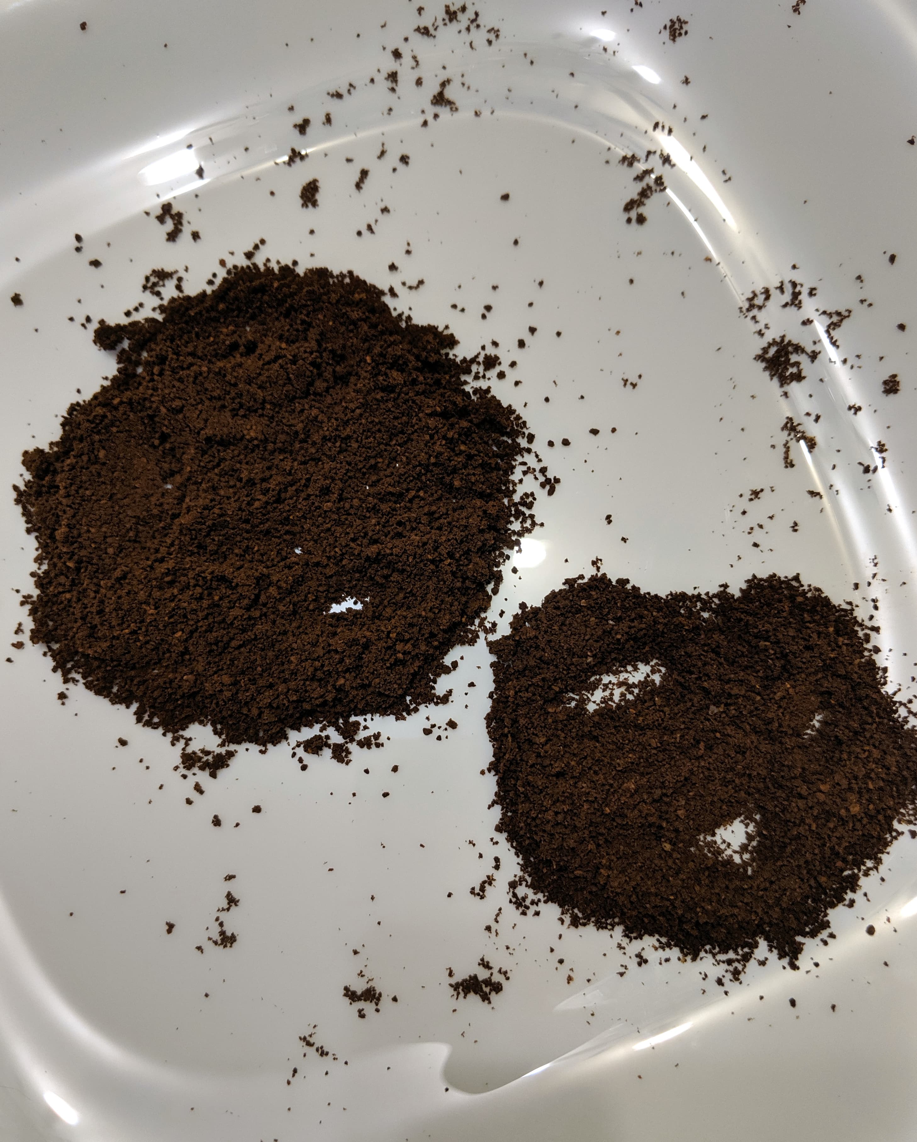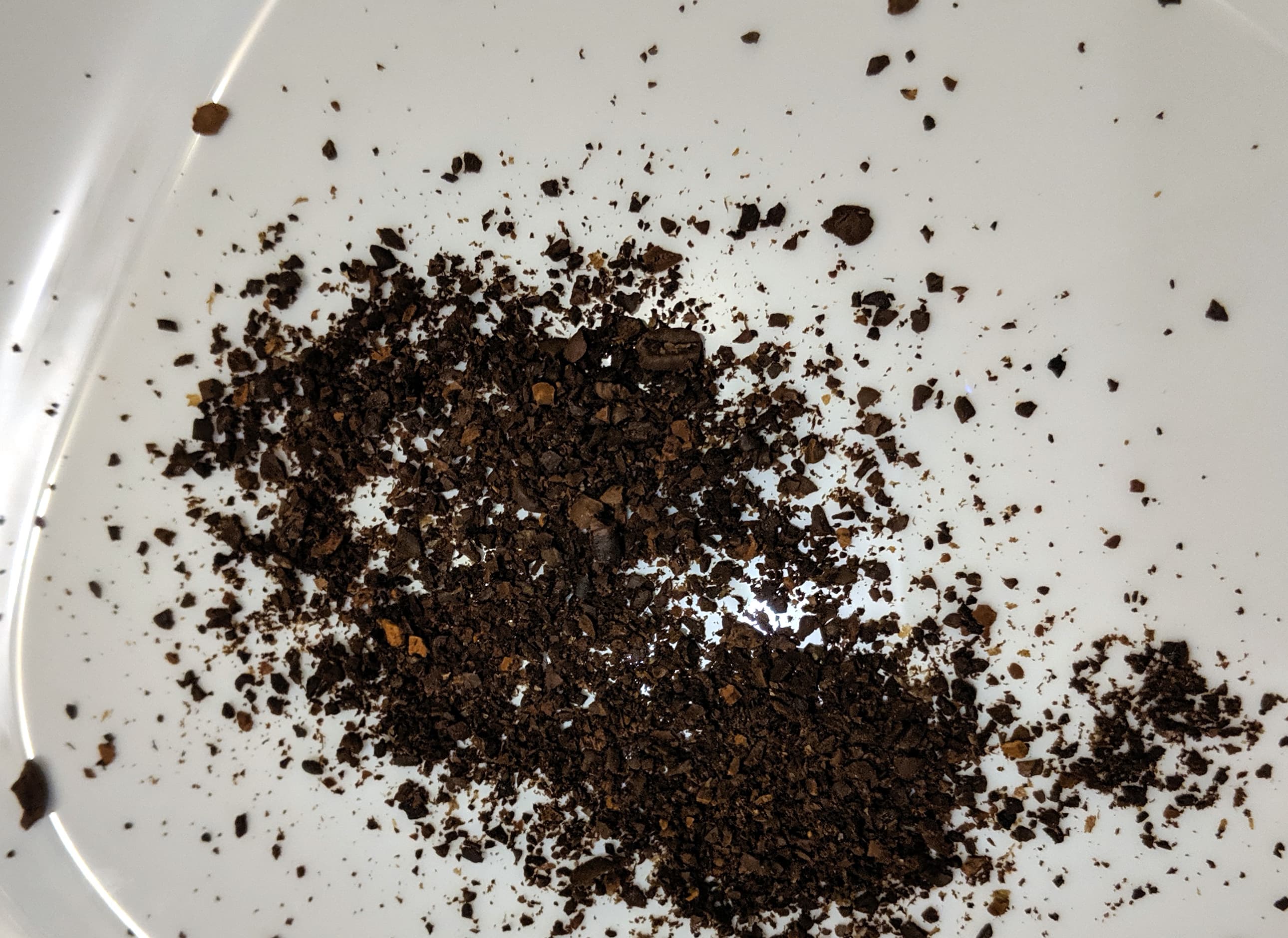 Через пять секунд все зерна были перемолоты, но частицы кофе были крупными, с острыми углами. Через еще пять (суммарно 10) секунд углы сгладились, но размер частиц был все еще крупнее фабричного. Еще 10 секунд: все частицы стали мельче и более однородными, но более крупными, чем контрольный образец. Догнали время перемалывания до 30 секунд суммарно — и вот практически идентичный фабричному результат.
