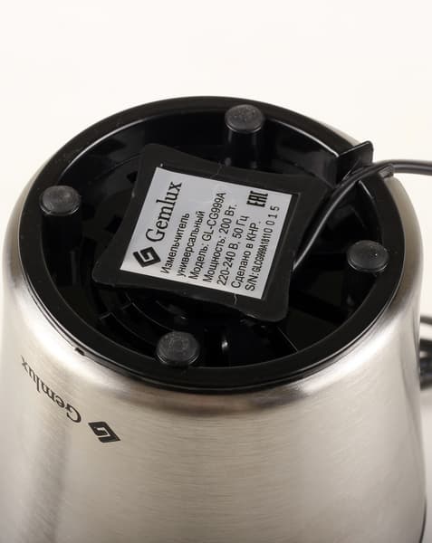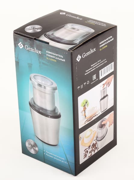 Коробка, решенная в традиционных для Gemlux черно-бирюзовых цветах, изображает универсальный измельчитель как в сборе (на широких сторонах), так и в разобранном виде и полной комплектации (на одной из узких сторон). На всех сторонах также названы фирма и модель, а на широких в красивом лейбле указана мощность — 200 Вт и перечислены два главных достоинства: разовая загрузка до 70 г и полуавтоматическая работа.