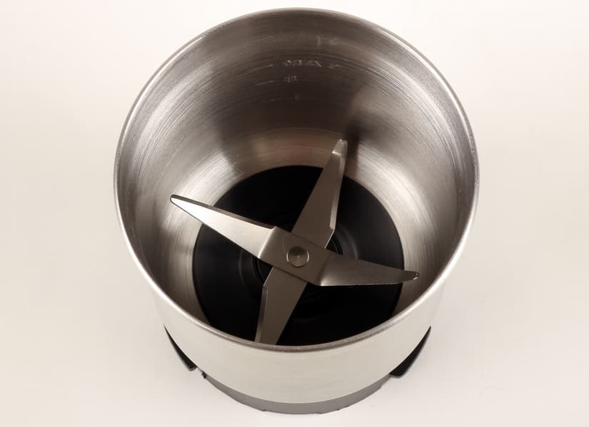Обе чаши из нержавеющей стали, но одна, с прямым двухлопастным ножом, — это, собственно, кофемолка, а вторая, с крестовым четырехлопастным — чоппер. Обе чаши сделаны на совесть, гладкие, удобные, с острыми ножами.