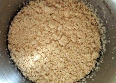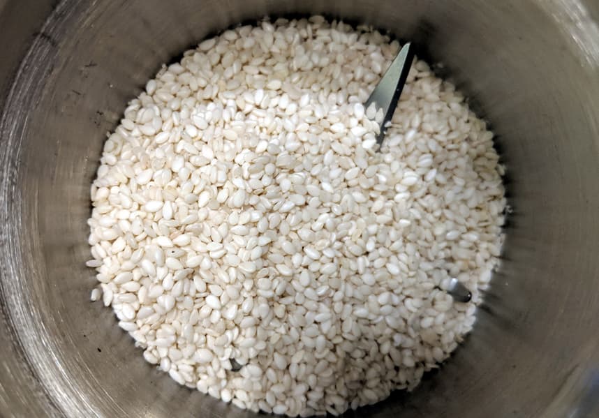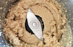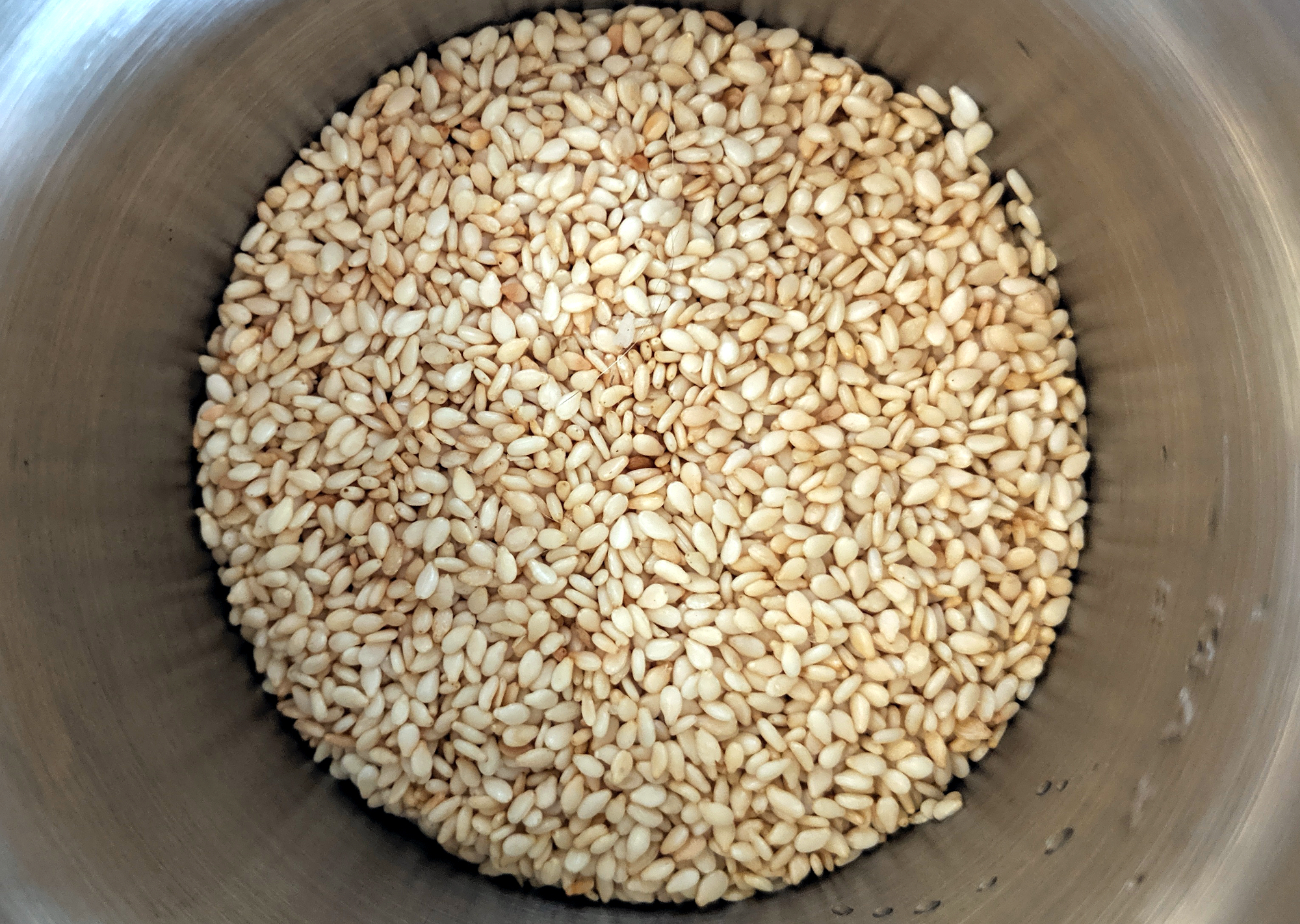 Затем мы обжарили такую же порцию кунжута на сухой сковороде до приятного кремового цвета и смололи в чаше с прямым ножом. За 8 секунд получилась похожая на первую мука, но с более выраженным ореховым вкусом. В нее мы добавили половину чайной ложки растительного масла (можно было больше) и через еще три секунды получили однородную густую массу, которая напоминает по виду халву: тхину.