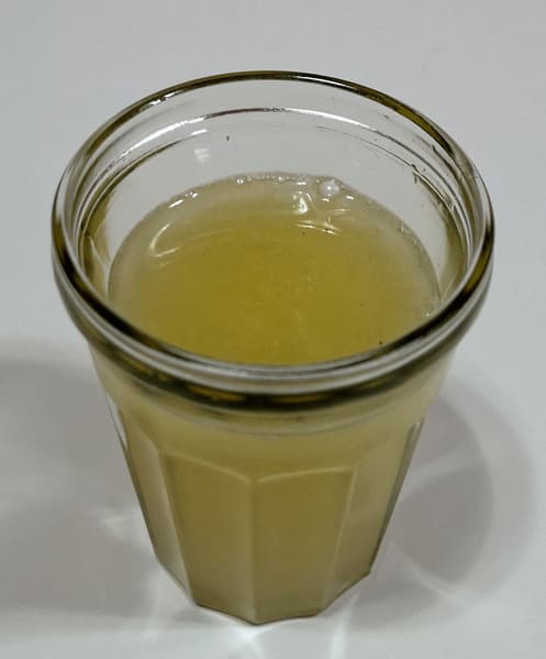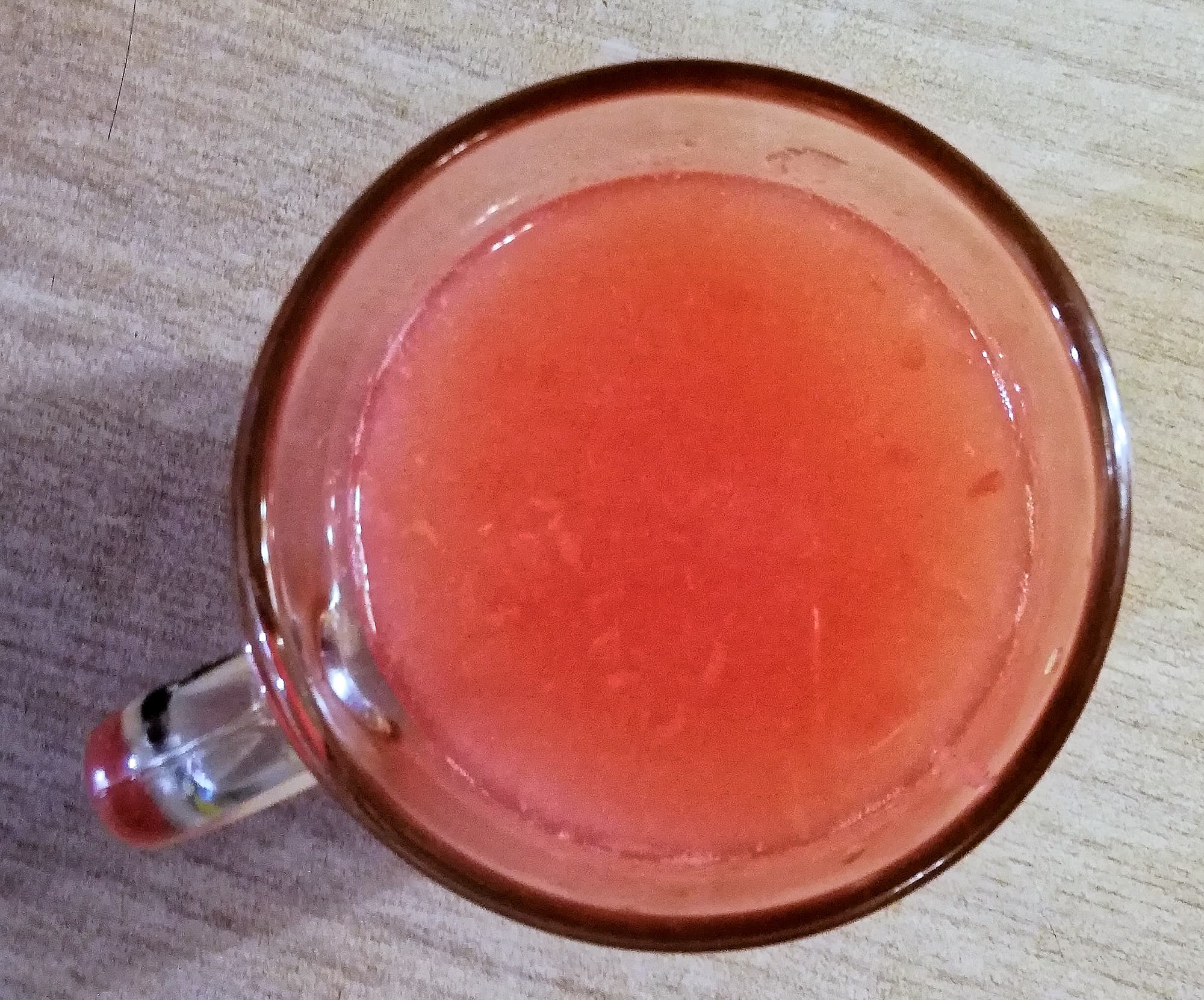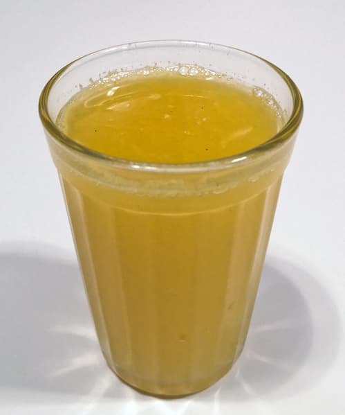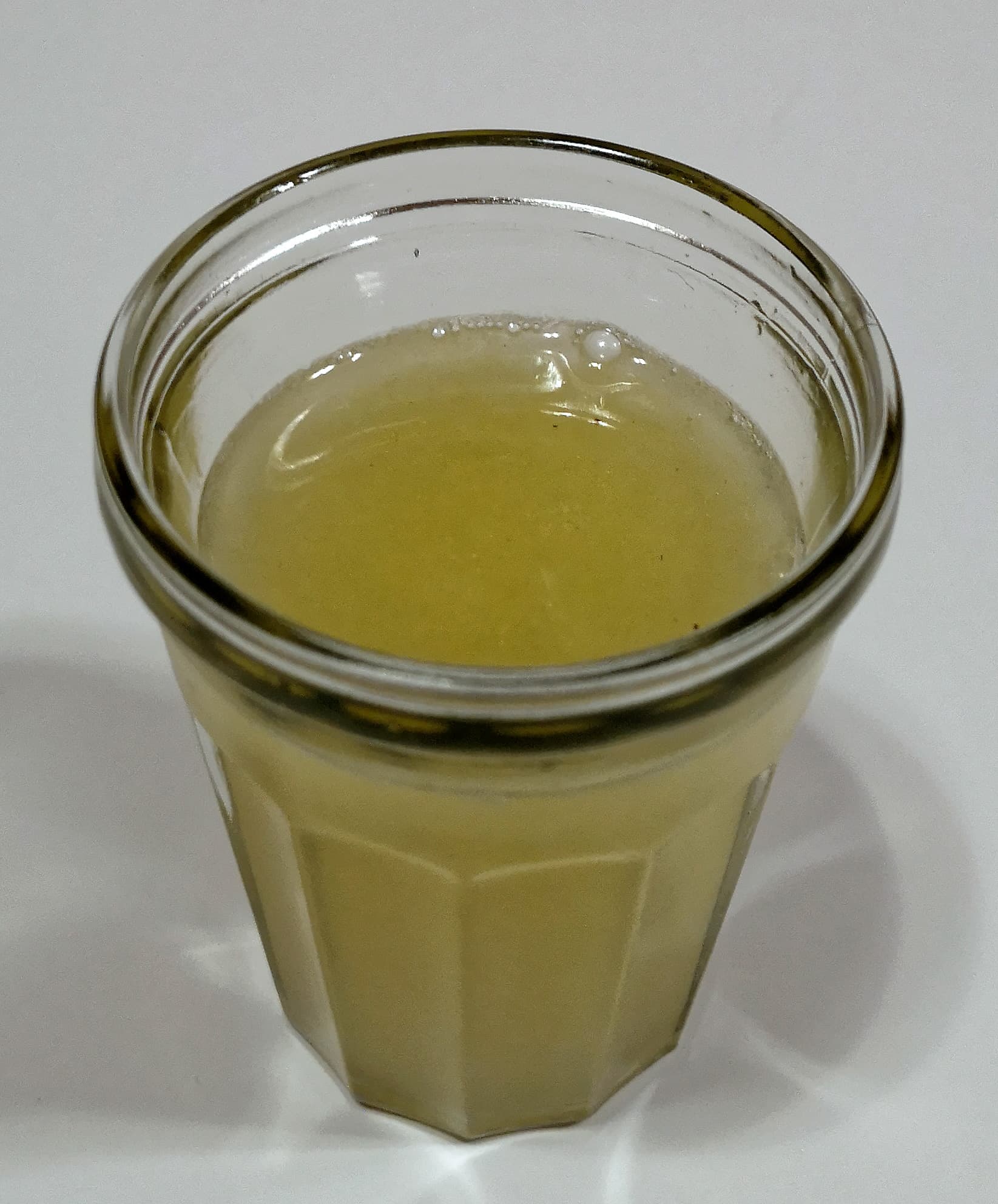 Выход сока — 620 г, это 59,44% эффективности. Сам сок получился таким же, как и апельсиновый — слегка мутноватым, но без частиц.