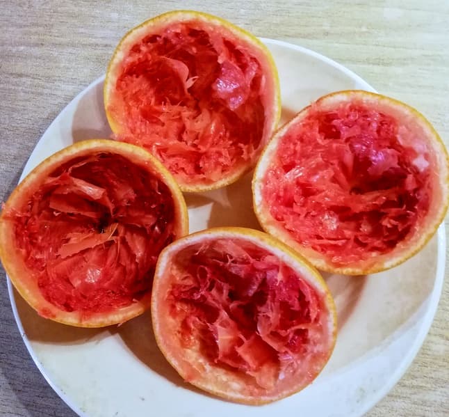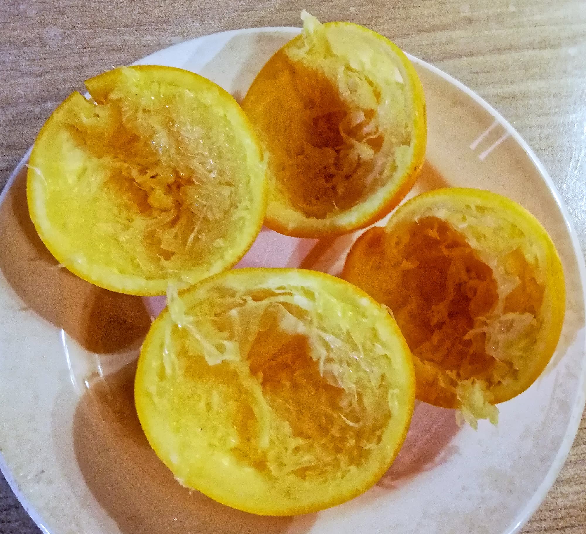 Цитрусы были обработаны быстро и непринужденно, выход сока оказался явно больше, но здесь осталось больше мякоти на кожуре. В принципе, можно было попробовать выжать еще раз, но это уже было бы нечестно.