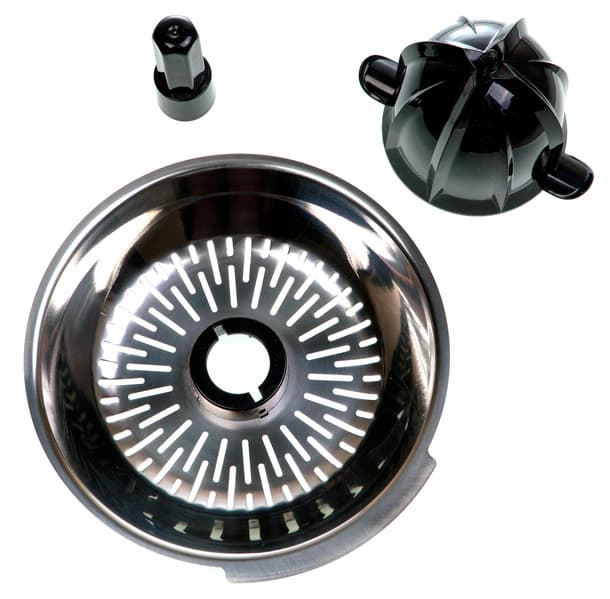 Моторный отсек расположен внизу, а сверху — вал для вращения сокосборника, фильтр и два типа насадок для различного размера фруктов.