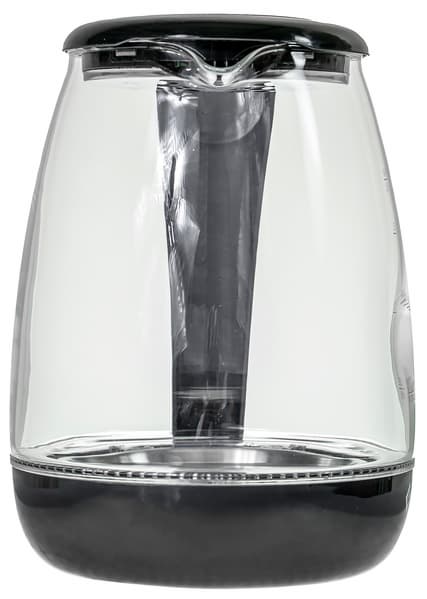 При знакомстве чайник произвел на нас нейтральное впечатление. Дизайн прибора строгий, качество сборки — неплохое. Основной материал — черный пластик (выглядит откровенно недорогим) и стеклянная колба. Давайте рассмотрим прибор повнимательнее.