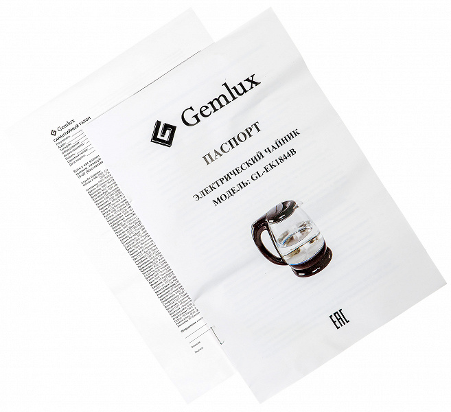 Чайник прибыл в нашу лабораторию в черной коробке с логотипом Gemlux, изображением самого прибора и подробным описанием возможностей устройства. На боковых гранях — краткая информация о технических характеристиках прибора.
