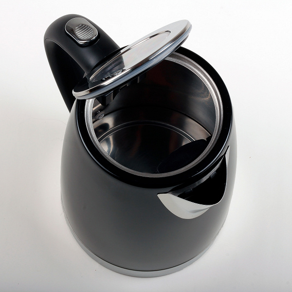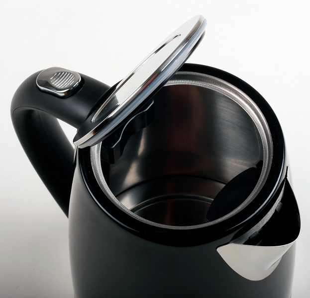 Корпус чайника на первый взгляд выглядит... пластиковым. Уж больно мы привыкли к тому, что если чайник сделан из нержавейки — то это гордо выставляется на всеобщее обозрение. Здесь же колба из нержавеющей стали снаружи аккуратно выкрашена в черный цвет.