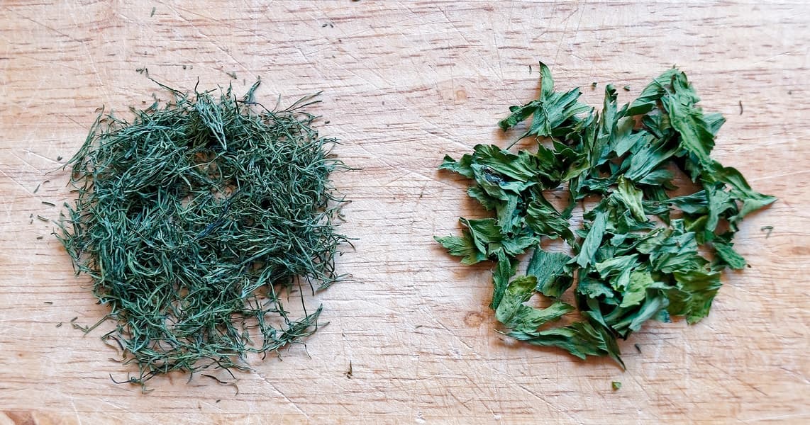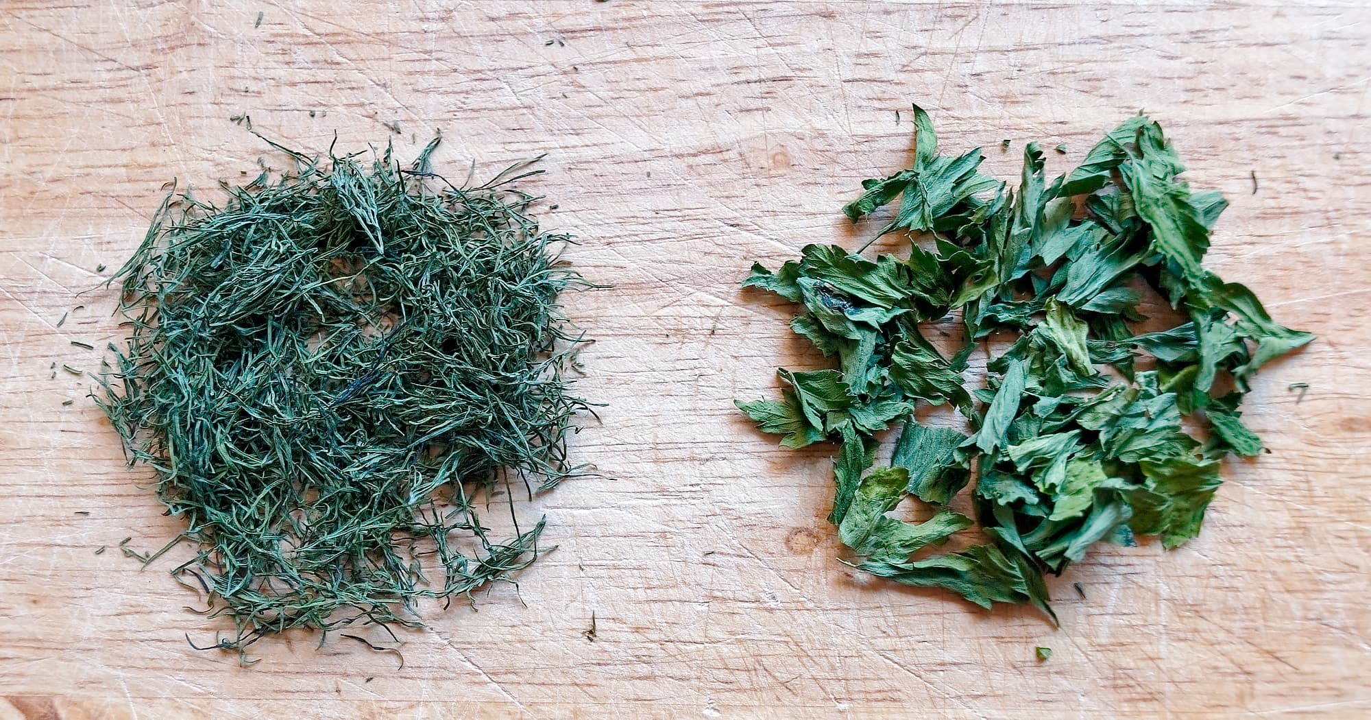 Через 7 часов листья укропа уже высохли, а вот стебли и петрушка были еще не в кондиции. Увеличили температуру до 50 градусов. В общей сложности ушло 13 часов и 1,8 кВт·ч на то, чтобы довести зелень до ума. Даже по истечении этого времени стебли не вызывали у нас доверия, поэтому мы просто провели по ним пальцами, стряхнув высохшие листья, а сами стебли выбросили.