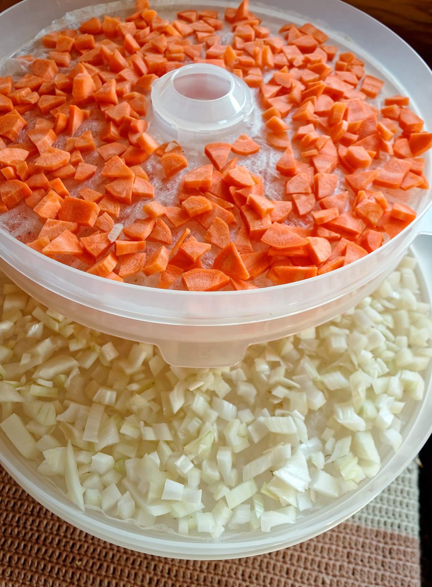 500 граммов моркови порезали четвертькольцами, огромную 300-граммовую луковицу — кубиками. Выстелили поддоны лутрасилом и разложили корнеплоды, которые заняли три поддона. 55 градусов, таймер на 10 часов.