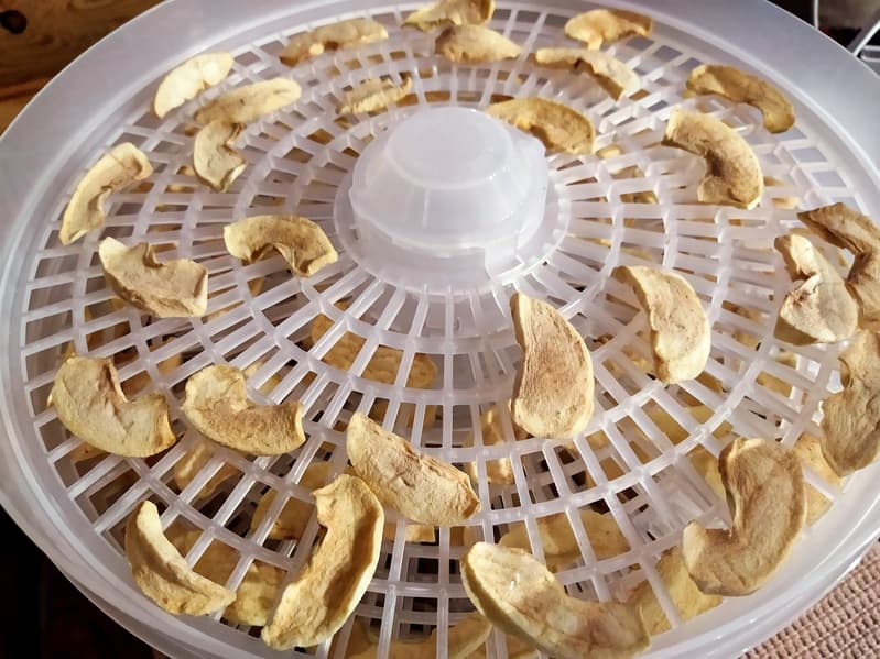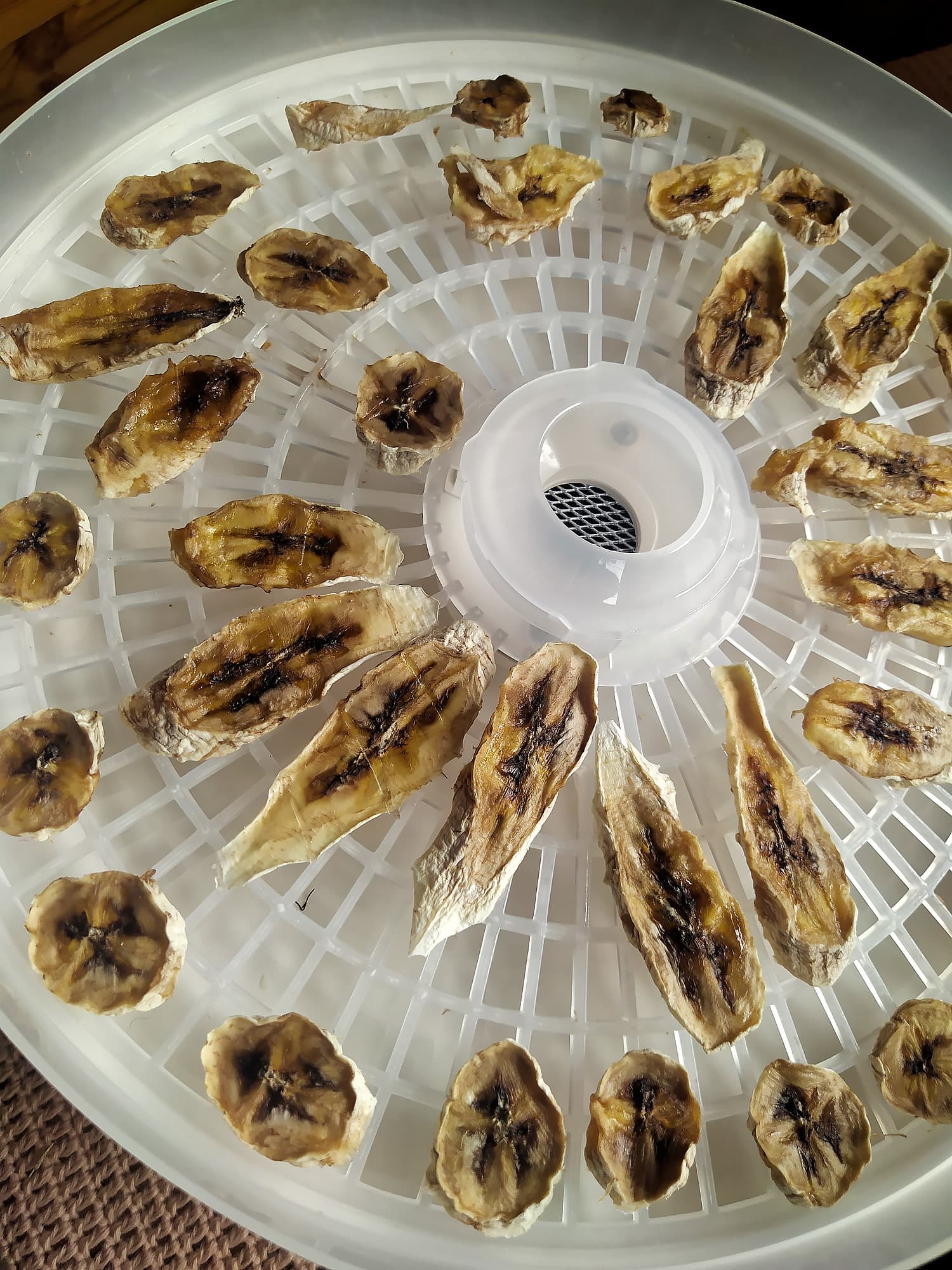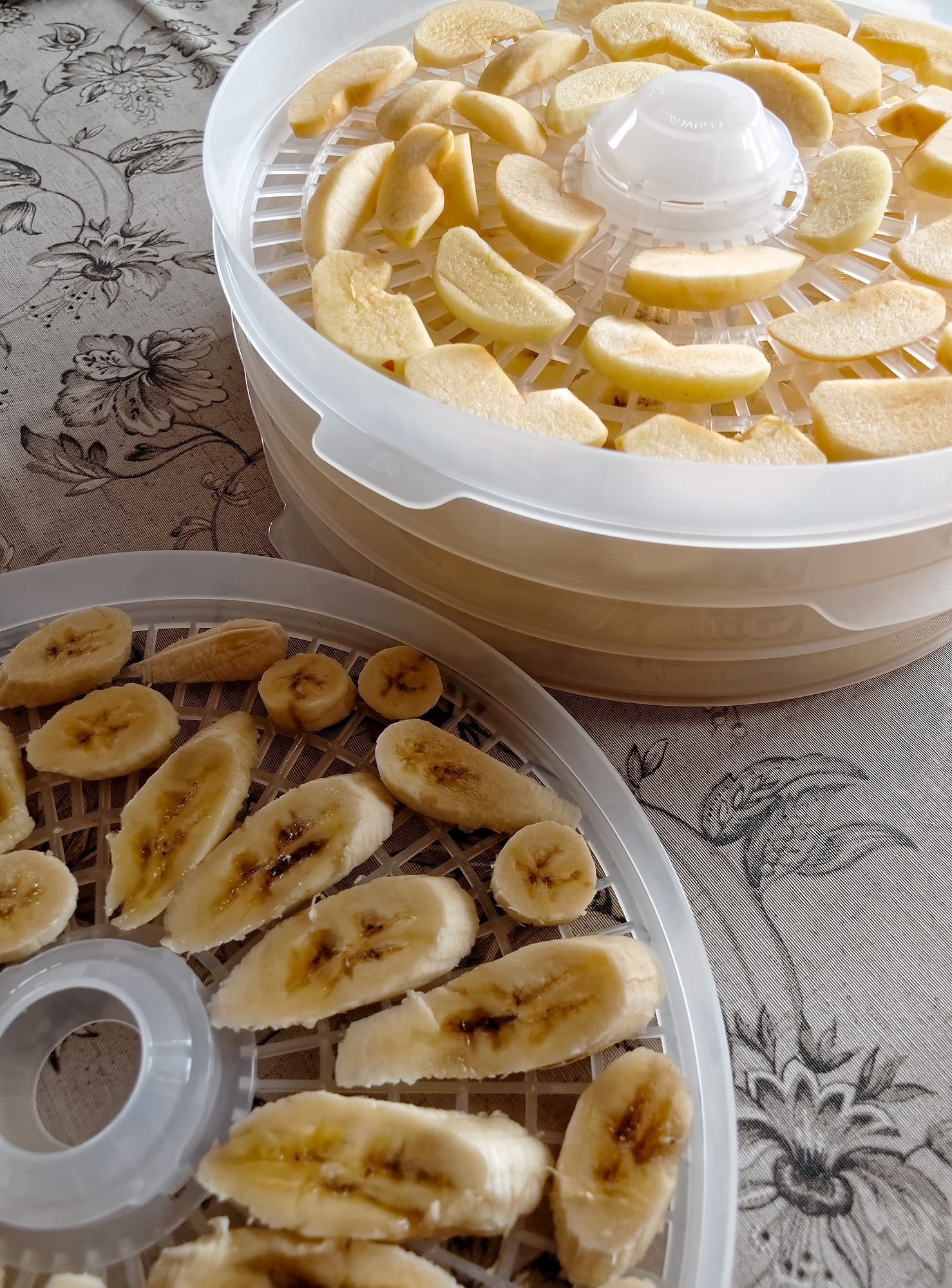 Для начала очистили от кожуры и сердцевин яблоки и порезали тонкими дольками (до 7 мм). На каждый поддон влезало в районе 300 граммов фруктов, так что на трех с половиной поддонах мы успешно расположили около килограмма. 4 крупных банана (каждый без шкурки — примерно 170 граммов) заняли оставшиеся полтора лотка.