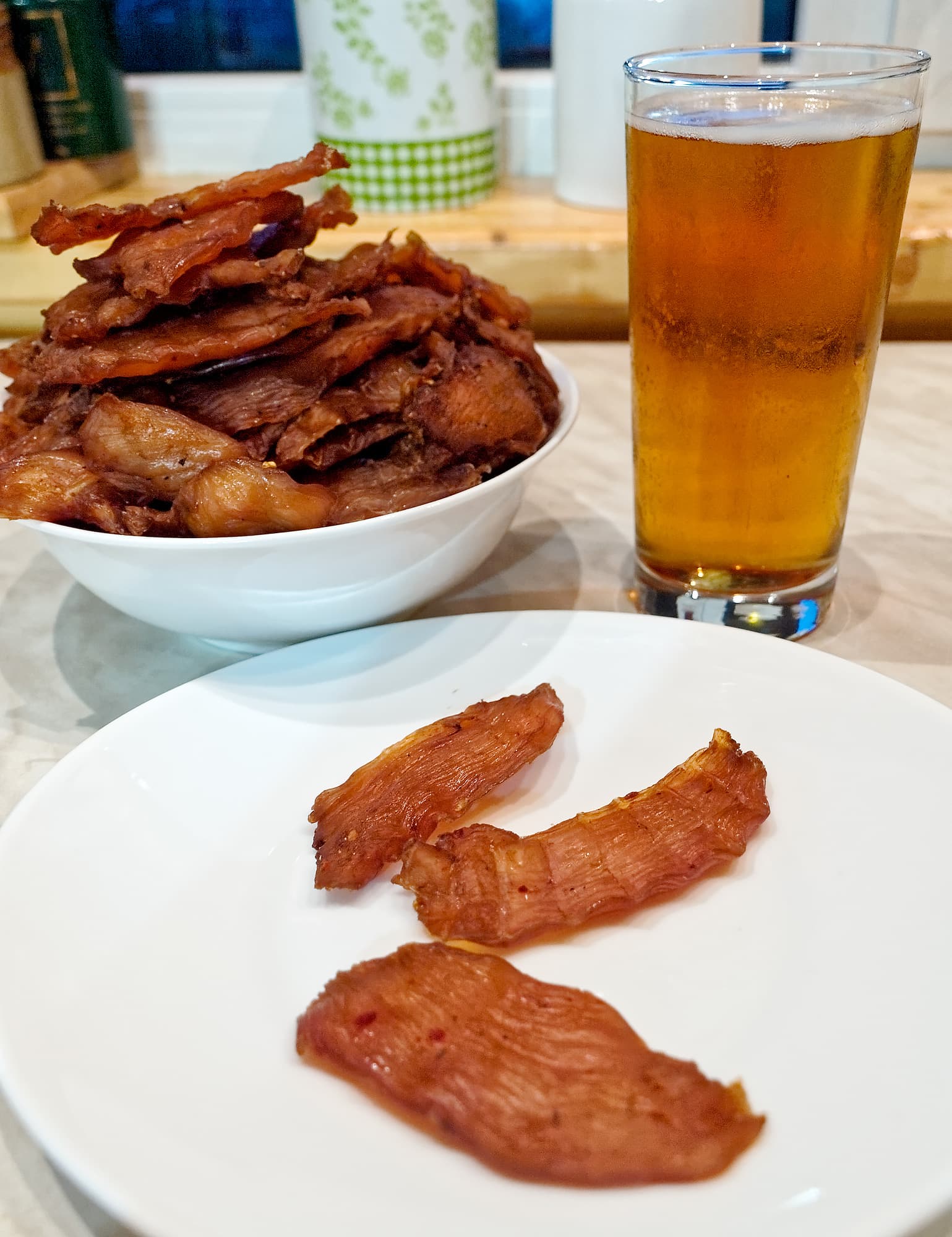 За это время сушилка потребила 2 кВт·ч. Всего мы получили 650 граммов отличного пряного джерки. К такой закуске пиво само напрашивается, но и воздерживающиеся дегустаторы остались очень довольны.