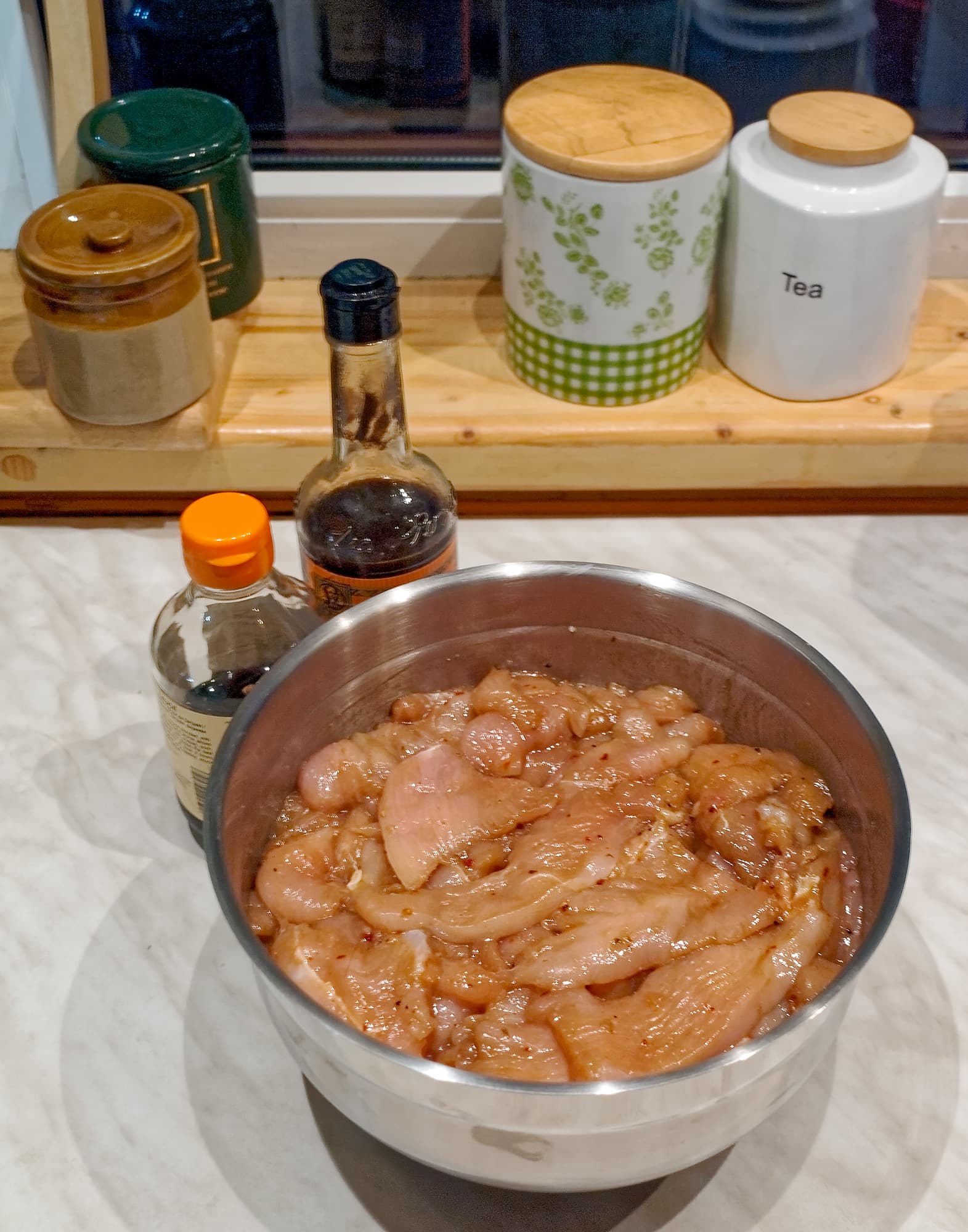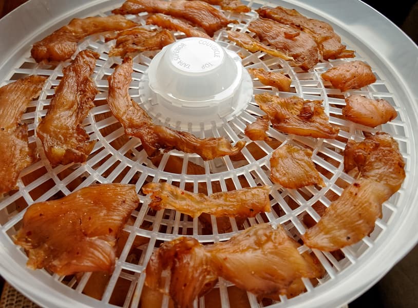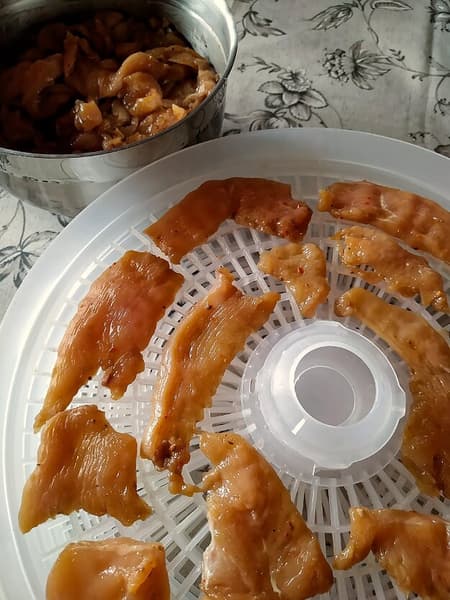 Вяленое мясо, или джерки, обычно готовится не один день, но с дегидратором процесс займет несколько часов. 1,5 кг филе куриных грудок хорошенько зачистили от жира (даже малейший его кусочек при длительном хранении придаст мясу прогорклый вкус), порезали тонкими ломтиками (5-7 мм) и замариновали на ночь в смеси соевого и ворчестерширского соусов, также добавили терияки, горчицы, сухого чеснока, бадьяна, фенхеля и сычуаньского перца. Главное условие — курица должна провести какое-то время в соленой среде, остальные ингредиенты могут быть любыми, их спектр ограничен лишь вашим вкусом и фантазией.