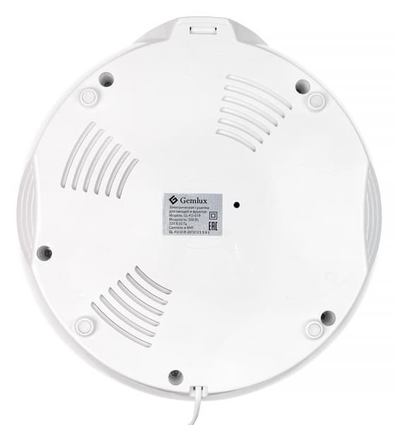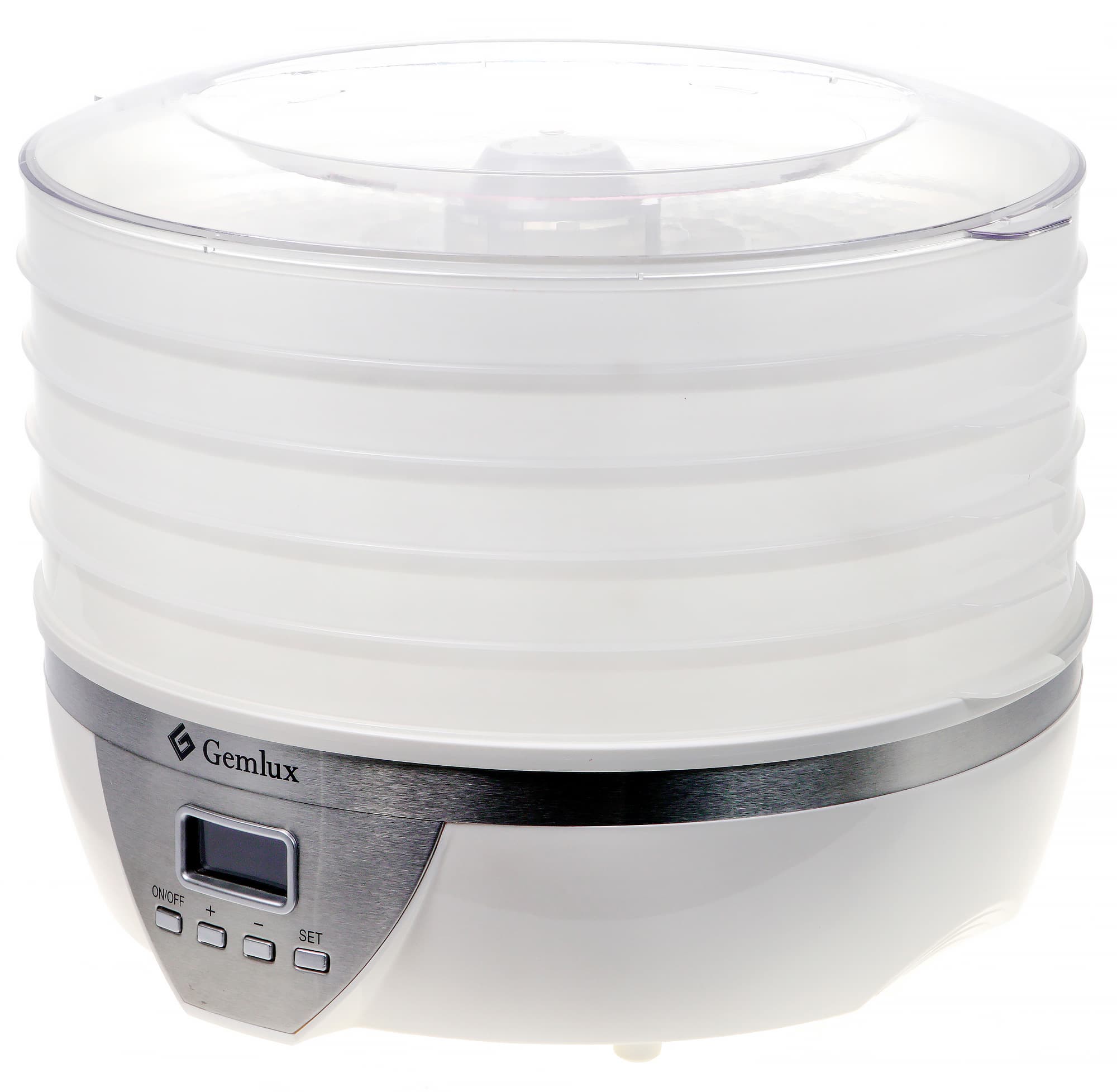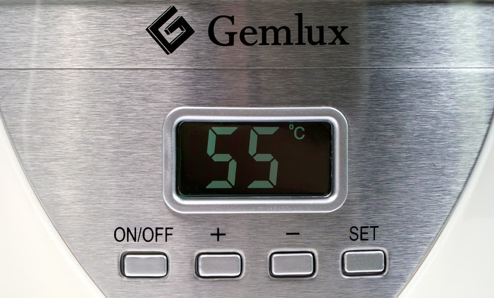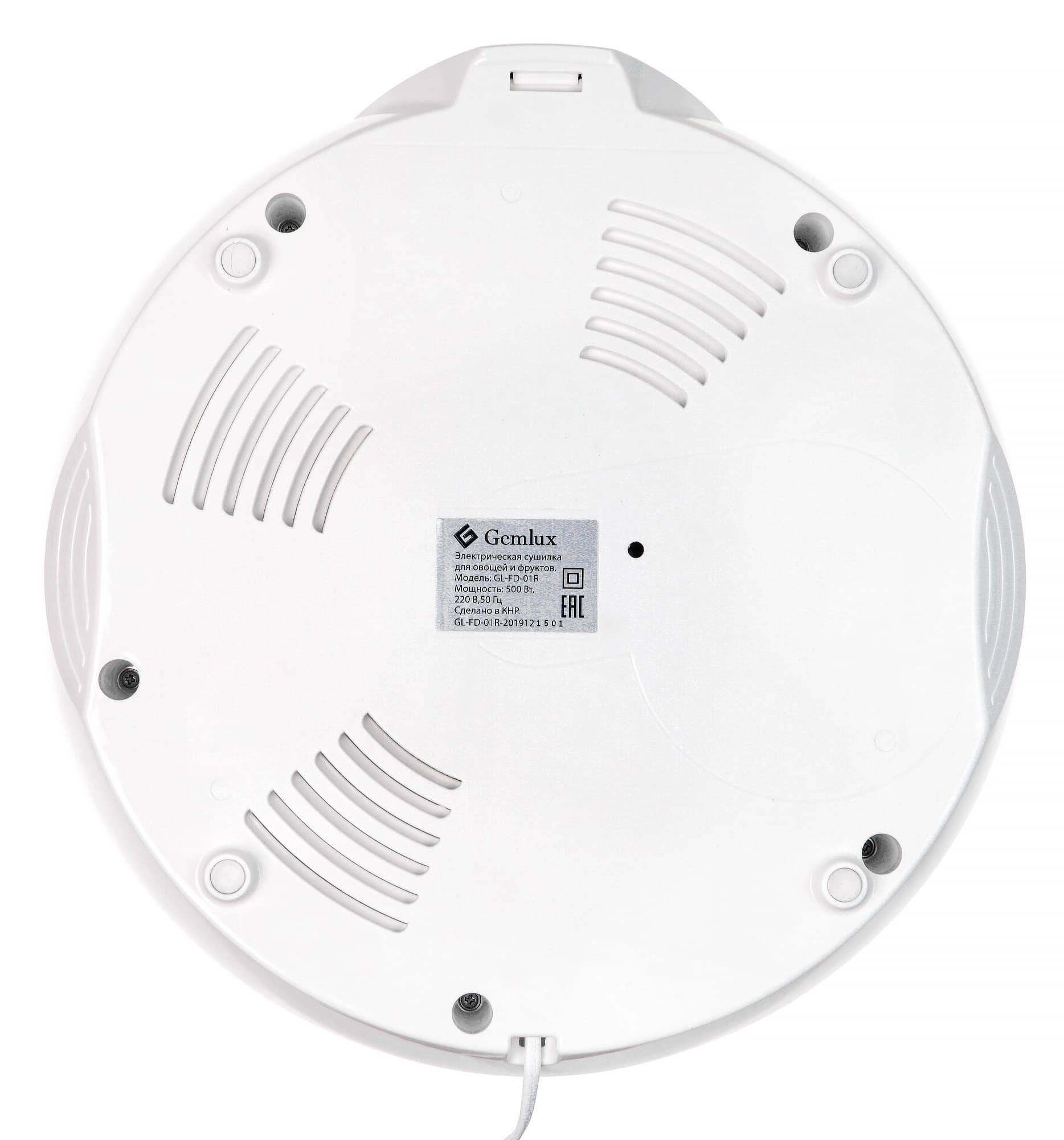 Если вы хоть раз сталкивались с недорогой конвекционной сушилкой, то в конфигурации GL-FD-01R не обнаружите ничего нового. В пластиковом корпусе высотой 11 см спрятаны тэны и вентилятор, разгоняющий горячий воздух по уровням. Сам корпус белый с окантовкой цвета «металлик». На передней его стороне расположена панель управления и дисплей, отображающий оставшееся время работы и температуру. С противоположной стороны выходит шнур электропитания.