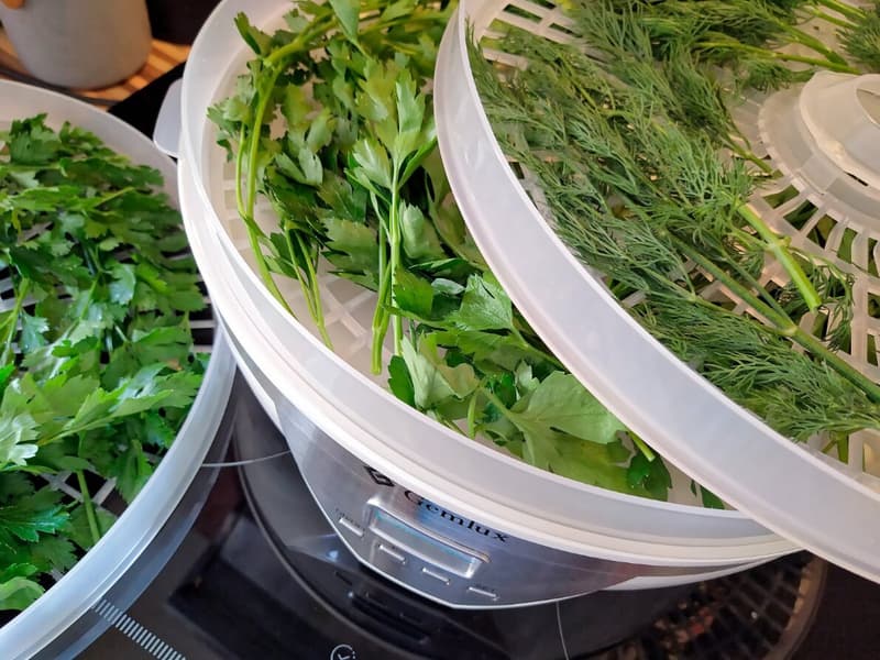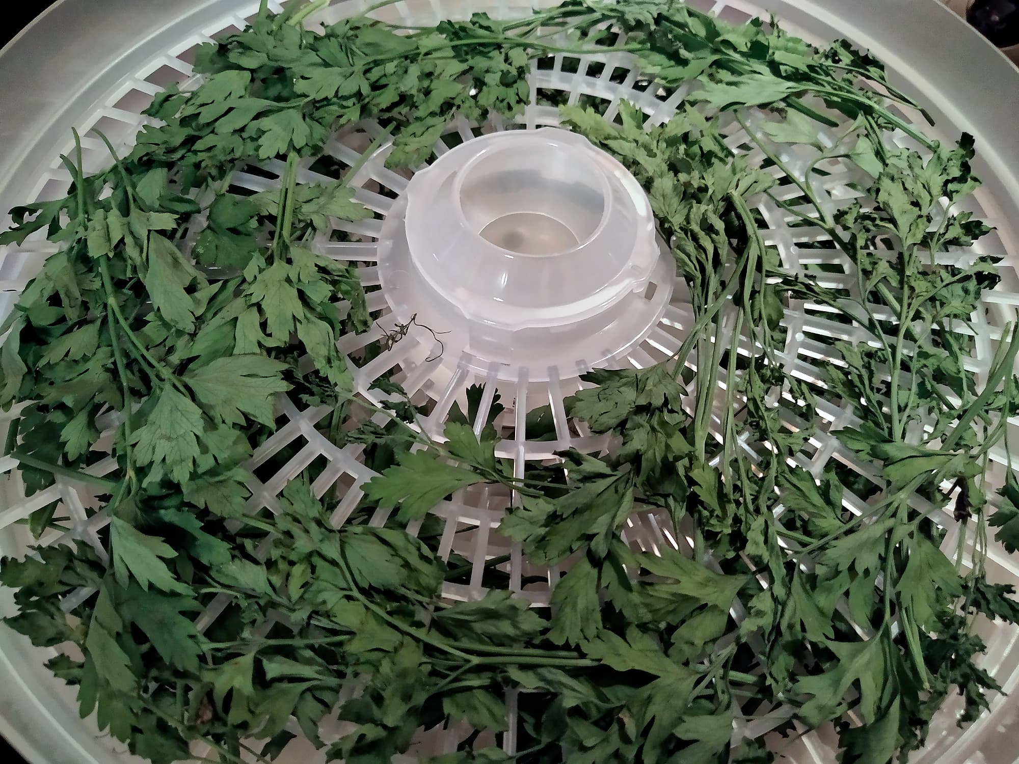 Сверились с инструкцией, установили температуру 45 градусов и запустили сушилку. Раз в пару часов приходилось менять поддоны местами поворачивать их вокруг оси, так как зелень просушивалась неравномерно даже внутри одного лотка.