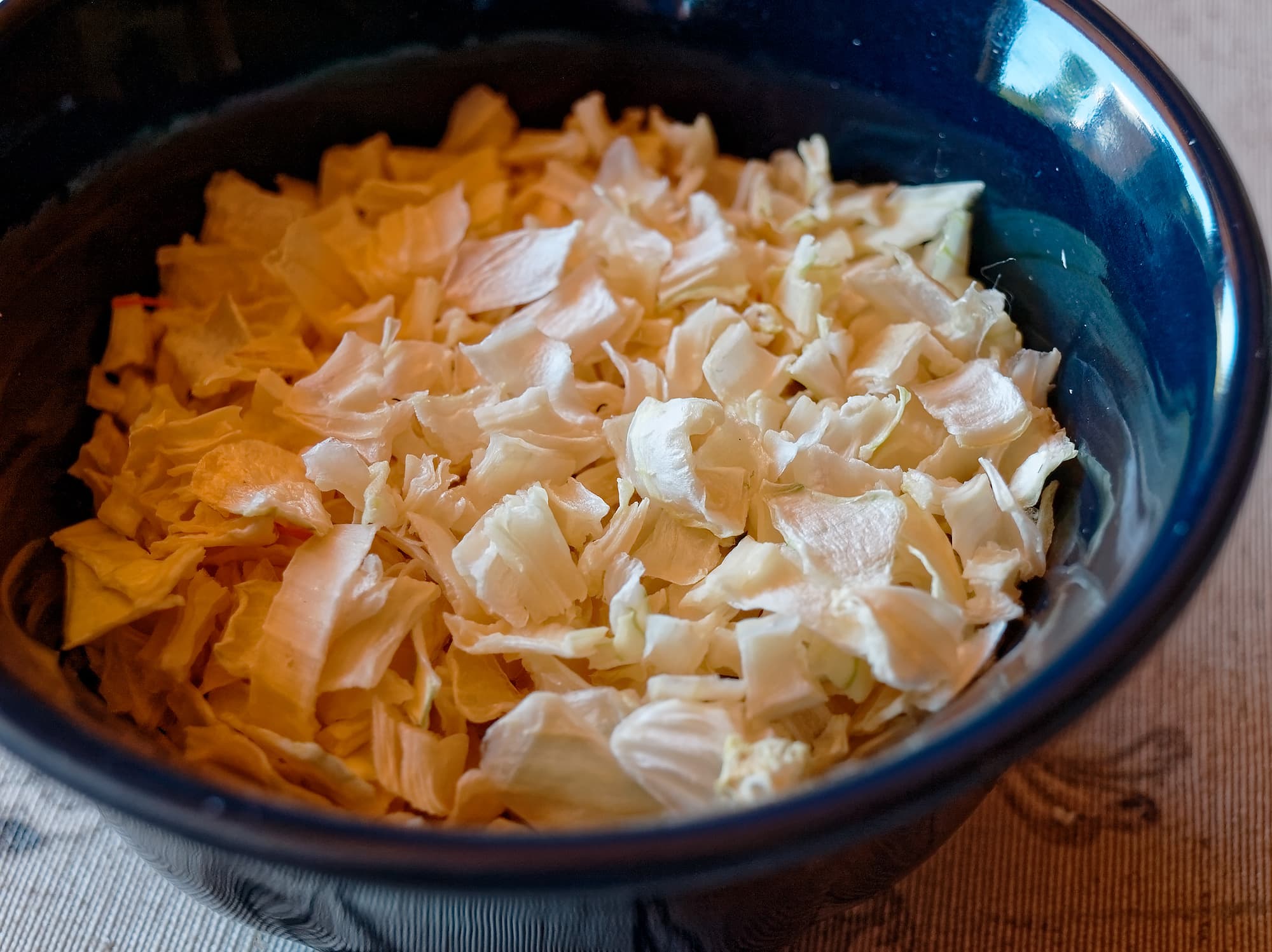 Морковь была готова через 9 часов (выход — 50 граммов). Лук досушивали еще 4 часа (выход — 40 граммов). Ваттметр показал 2,2 кВт·ч.
