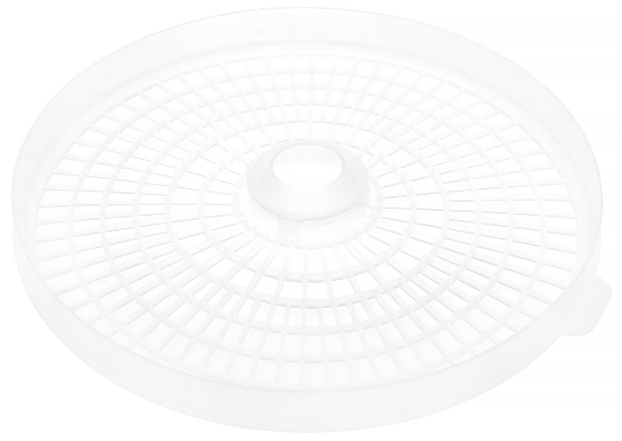 Дно лотков сетчатое, в центре отверстие диаметром 7 см. К сожалению, ячейки большие, то есть придется резать продукты крупно или мастерить подложки из марли или других подходящих материалов, ведь специальная подстилка для пастилы, которую можно было бы подложить под, например, ягоды, в комплект не входит. Поддоны одинаковые, за исключением одного: у него центральное отверстие закрыто пластиковым клапаном, который на трех языках сообщает нам, что этот лоток всегда должен стоять сверху. Этот факт нас не очень обрадовал: все-таки в вертикальных сушилках частенько приходится менять поддоны местами из-за неравномерного распределения теплого воздуха, и такое ограничение грозит нам лишними манипуляциями.