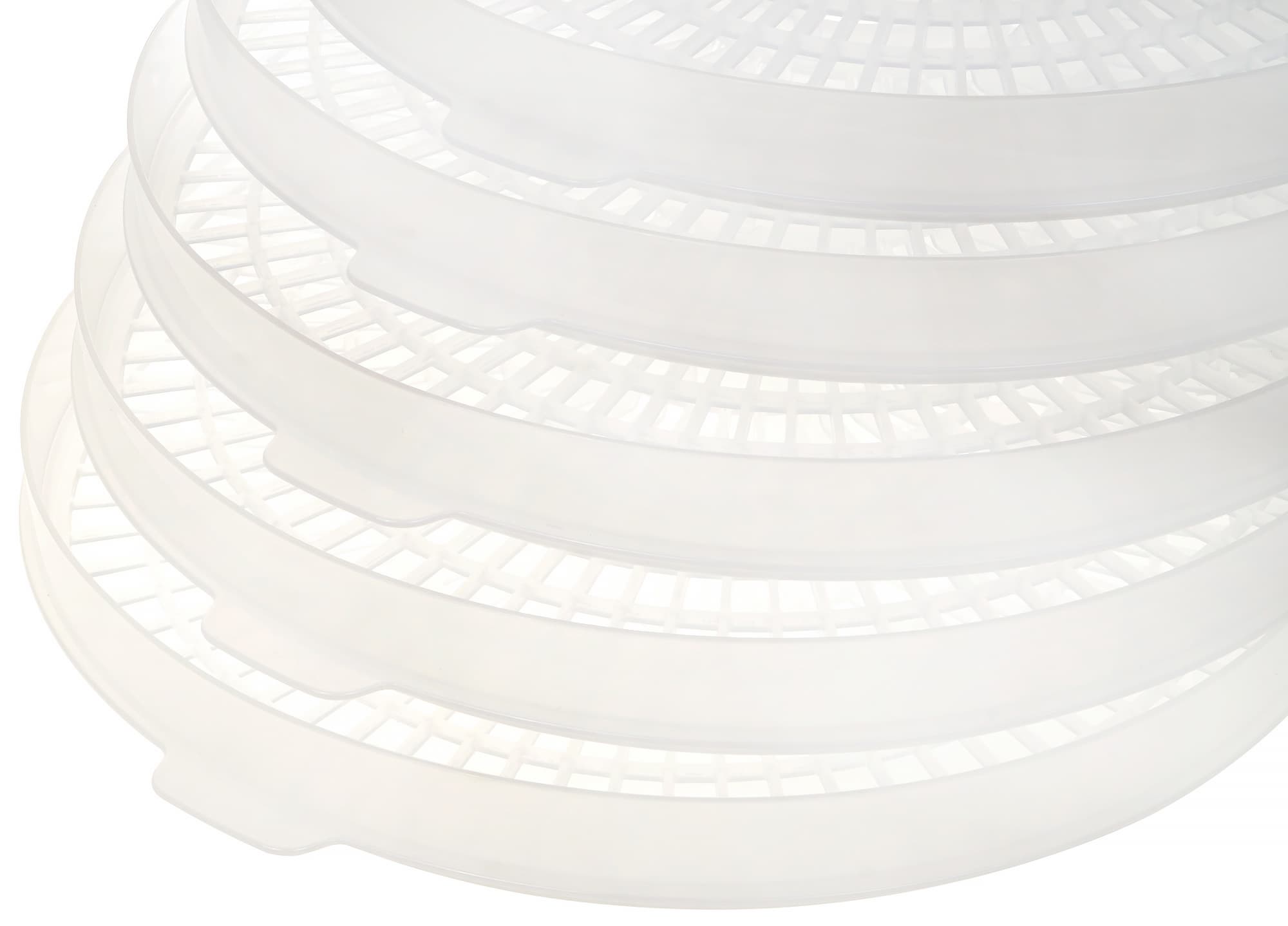 Пять поддонов диаметром 35 см и высотой 3 см, устанавливающиеся друг на друга, выполнены из светлого едва просвечивающего пластика.
