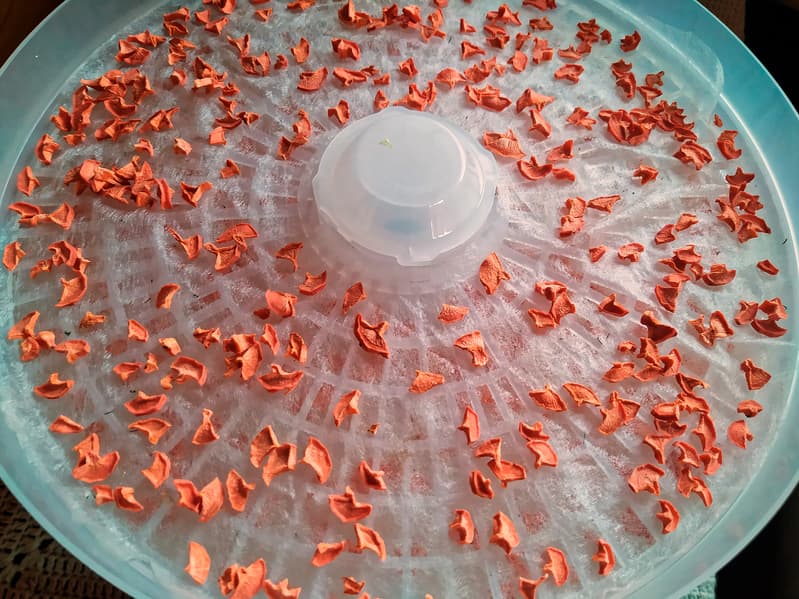 Как мы упоминали в начале, ячейки сетки лотков очень крупные, поэтому, например, зелень мы сушили прямо ветками, измельчали уже в сушеном виде. Морковь инструкция рекомендует нарезать кружками, но мы привыкли, чтобы корнеплод был высушен более мелкими кусочками, так что пришлось вырезать подложки из тонкого лутрасила. Зачастую к сушилкам в комплекте идут так называемые подстилки для пастилы, но не в этом случае. По идее, их можно купить отдельно, но выяснилось, что центральное отверстие в поддонах нестандартное: здесь оно 7 см в диаметре, а у большинства подобных устройств — 6 см, так что найти подходящий «тюнинг» непросто.