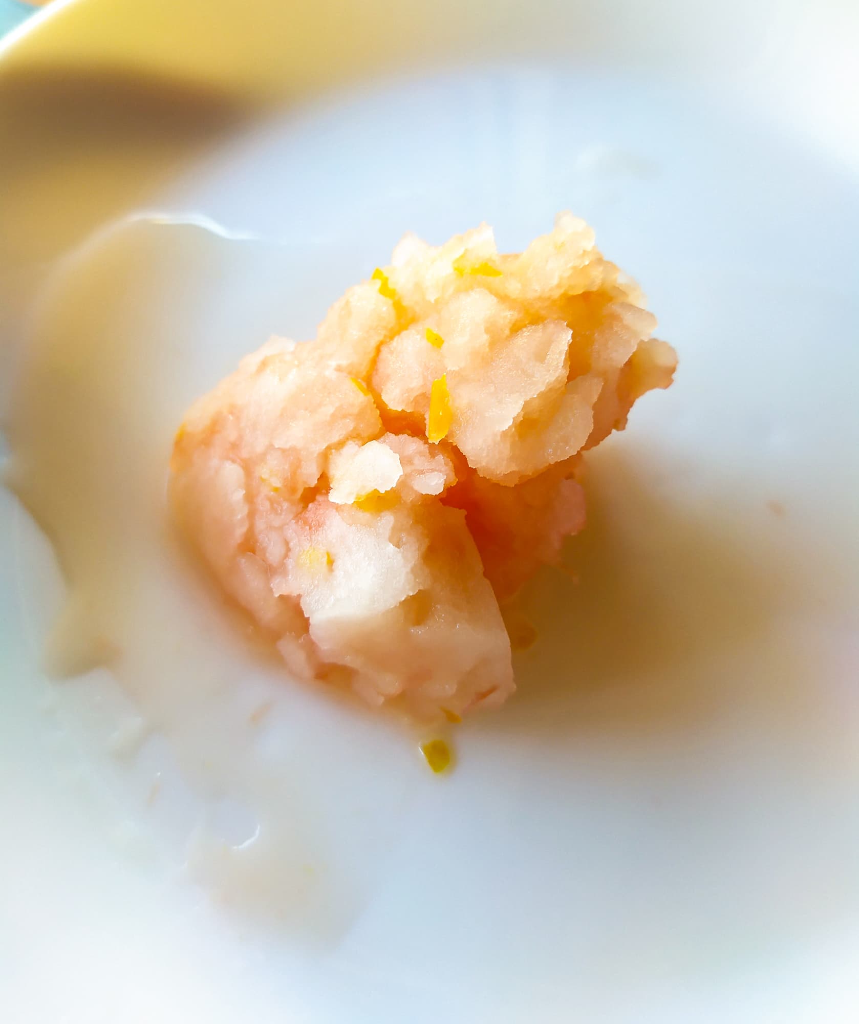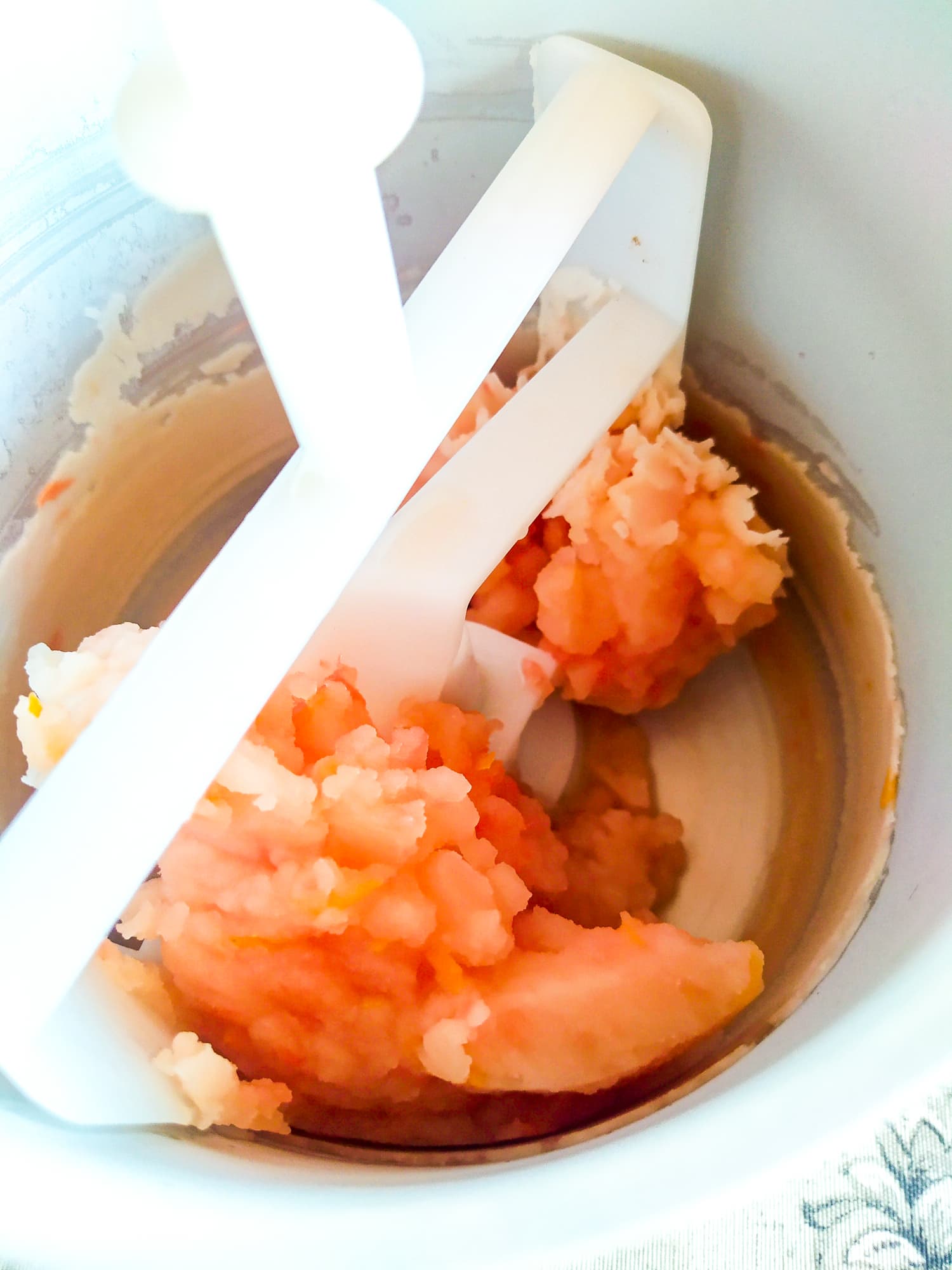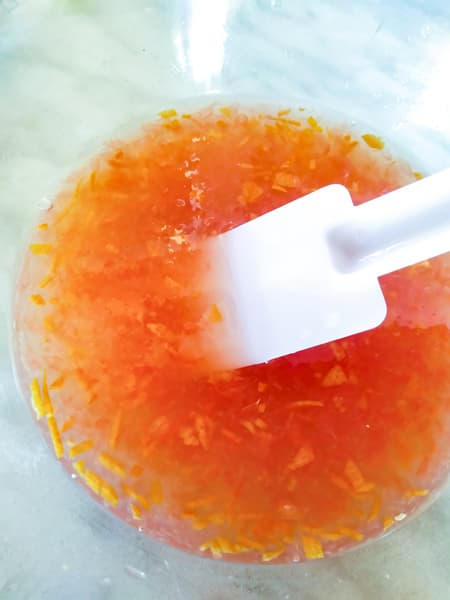 250 мл грейпфрутового сока (такое же количество указано и в книге рецептов) смешали с четвертью мерного стакана сиропа из цитрусовых (у нас оставался после приготовления цукатов) и столовой ложкой цедры. Из такого количества продуктов получается совсем немного смеси, дай бог на заполнение одной трети чаши хватило.