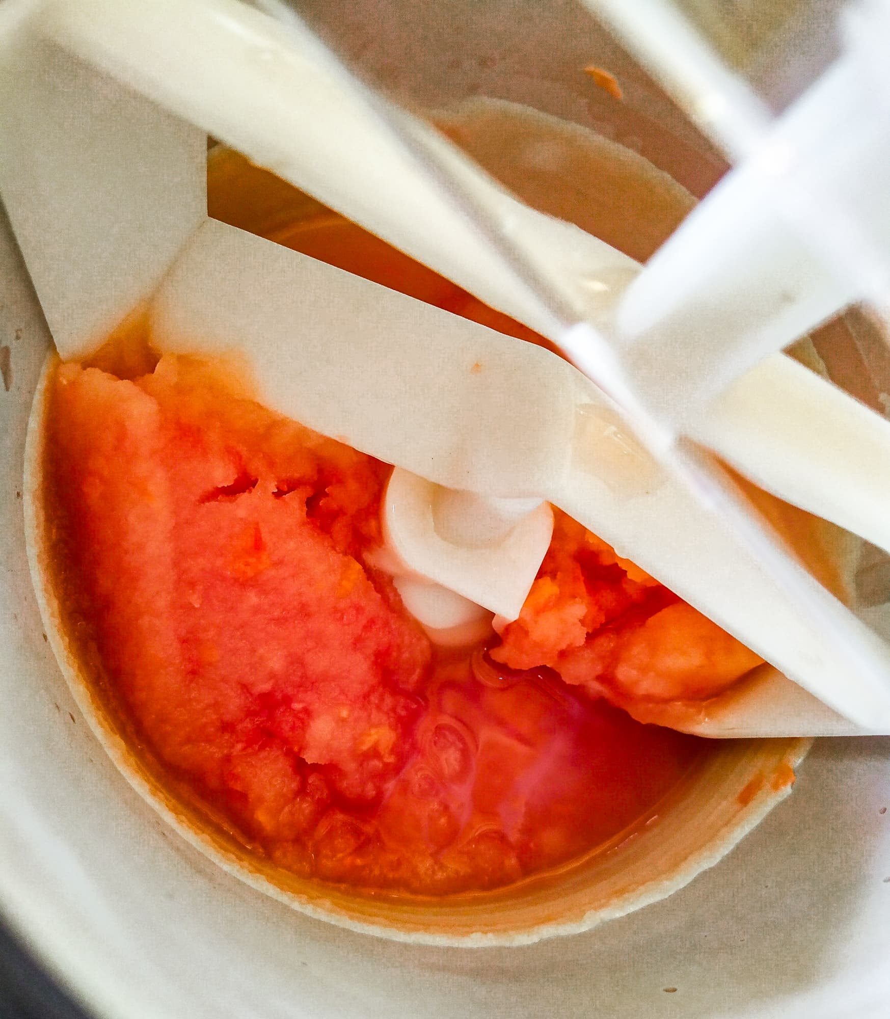 Сорбет очень мягкий, похож на ледяную кашицу и тает за доли секунды. Переложили его в контейнер и отправили в морозилку охолонуться. Кстати, выход совсем небольшой — где-то на 4-5 шариков.