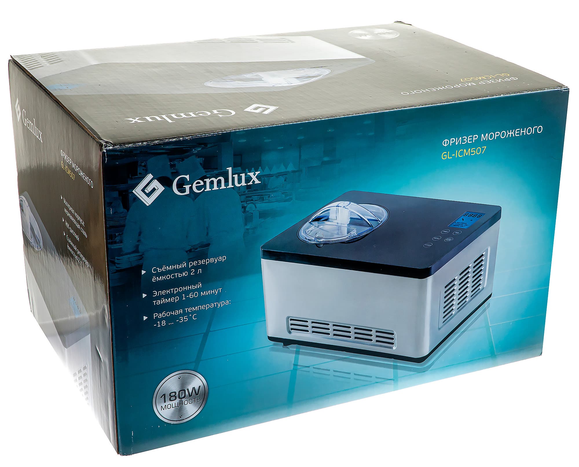 Упаковка, стандартная для Gemlux: черно-бирюзовая коробка, в правом верхнем углу — силуэты поваров, корпящих над столом, ниже — фото GL-ICM-507 и некоторые ее технические данные.