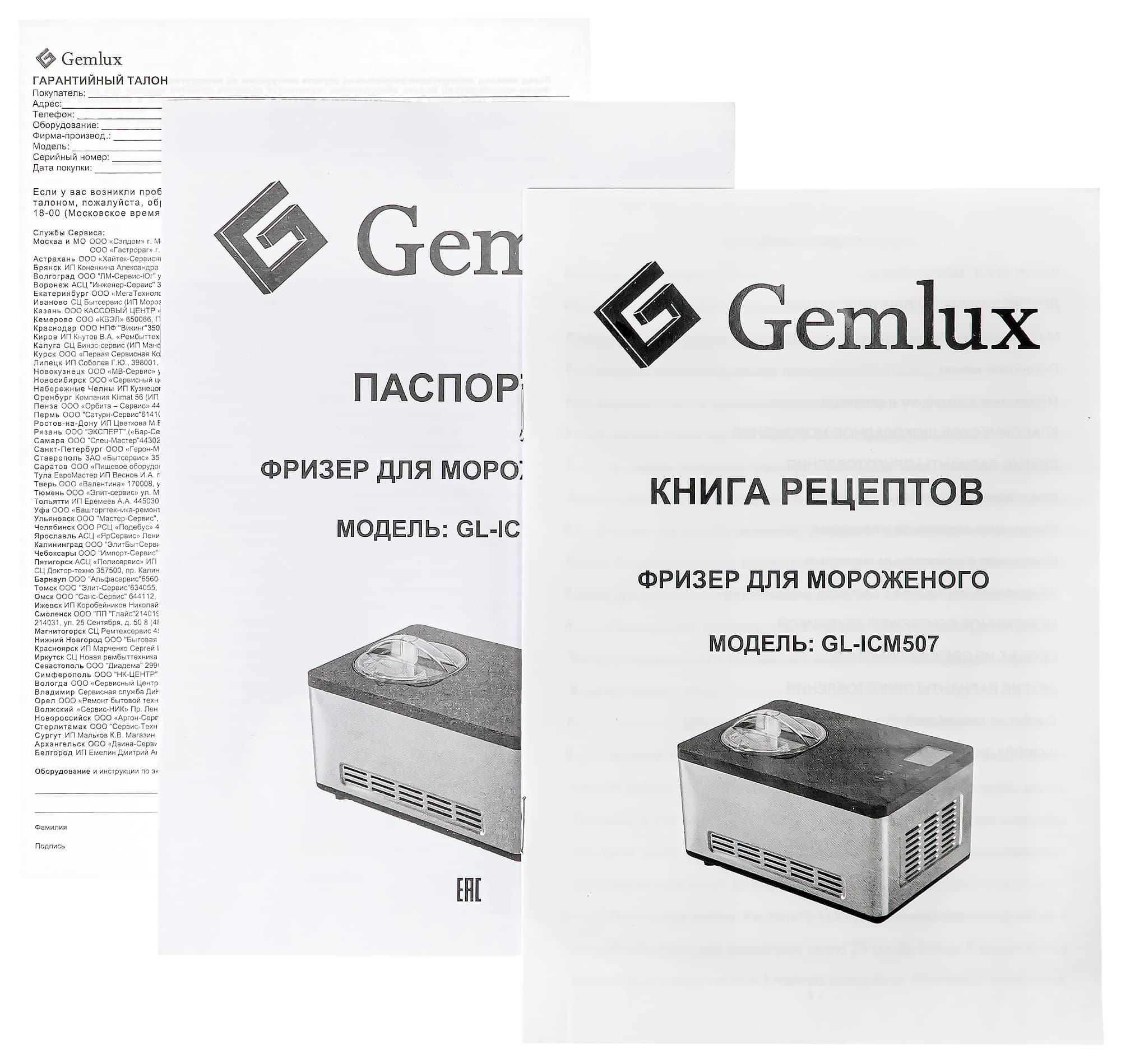 Паспорт прибора писал какой-то приверженец сестры таланта — текст, дополненный несколькими иллюстрациями, занимает всего шесть страниц. Здесь есть все традиционные разделы: меры предосторожности, описание элементов и функций прибора, указания по приготовлению мороженого и уходу за прибором. Рецепты собраны в отдельной 8-страничной брошюре.