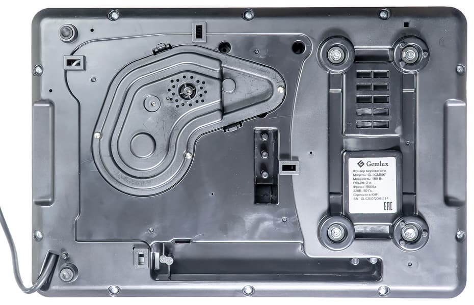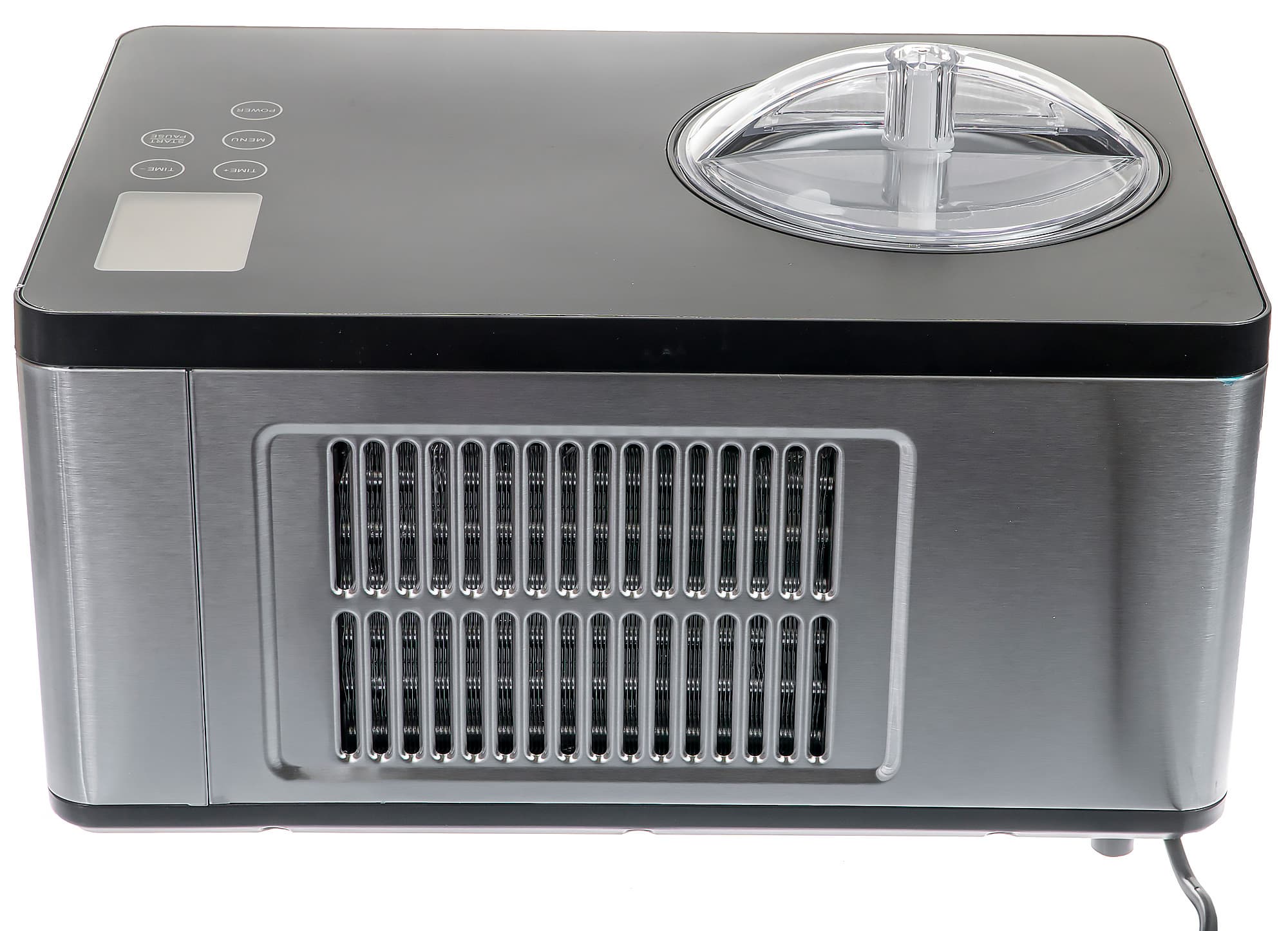 Итак, GL-ICM-507 — громоздкий и тяжелый агрегат, большую часть которого занимает, по-видимому, запрятанный в корпусе компрессор. При этом скроен он отлично: стальной корпус, никаких выпирающих стыков, нижний (более надежный, чем верхний) привод мешалки, металлическая муфта, удобное отверстие в крышке, сенсорная панель управления. Если отвлечься от габаритов (есть на рынке компрессорные мороженицы и поминиатюрнее), прибор создает самое благоприятное впечатление.