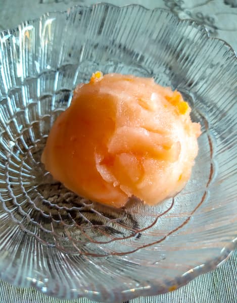 Посидев в холоде, сорбет слегка загустел, хотя остался очень мягким. Идеальный вариант для жаркого летнего дня: легкий нежирный десерт с освежающим вкусом грейпфрута без горечи.