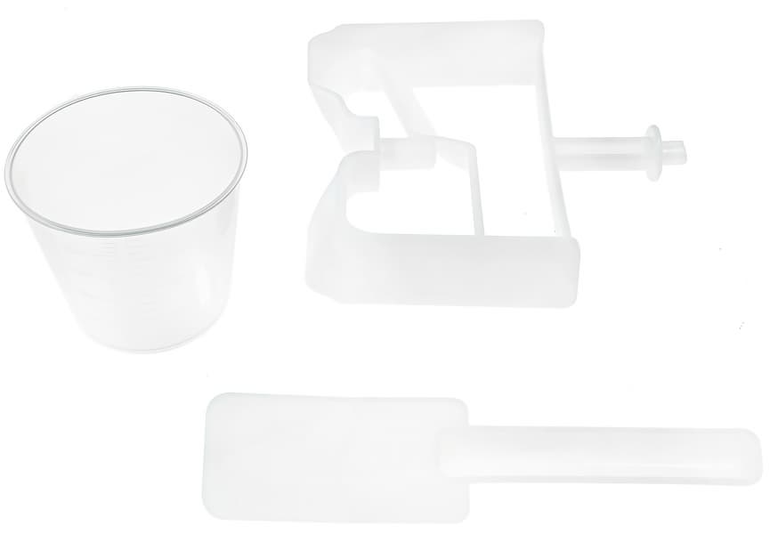 Мешалка, как и остальные аксессуары, выполнена из белесого пластика. На мерном стакане риски: миллилитры, чашки и унции.