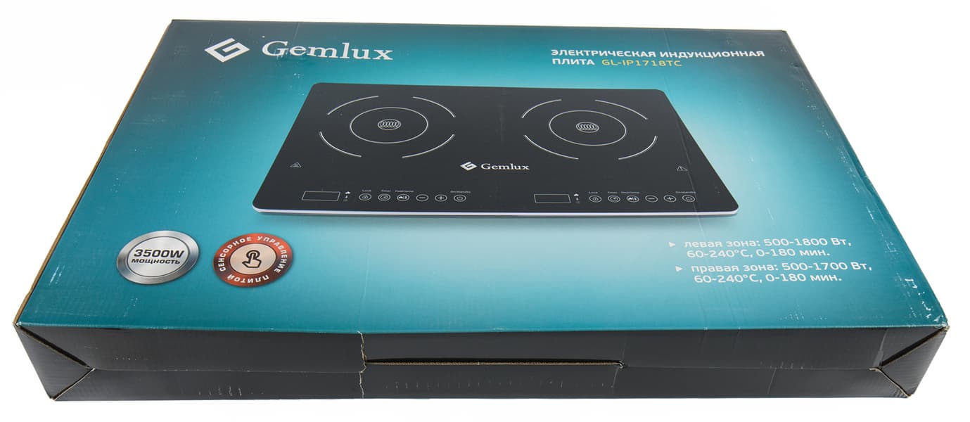 У нас на тестировании индукционная двухконфорочная плитка Gemlux с сенсорным управлением. Модель GL-IP1718TC — это настольная стеклокерамическая варочная поверхность довольно крупных размеров с раздельным управлением конфорками. Прибор оснащен стандартным набором функций и 7 предустановленными уровнями мощности нагрева и температуры. Одна из конфорок работает в диапазоне мощности от 500 до 1800 Вт, вторая — от 500 до 1700 Вт. В общей сложности мощность устройства составляет 3500 Вт, что уже позволяет говорить о том, что плитку можно использовать не только в домашних условиях, но и на полупрофессиональной кухне. В статье мы опишем процесс эксплуатации устройства, результаты практических тестов и наши впечатления.