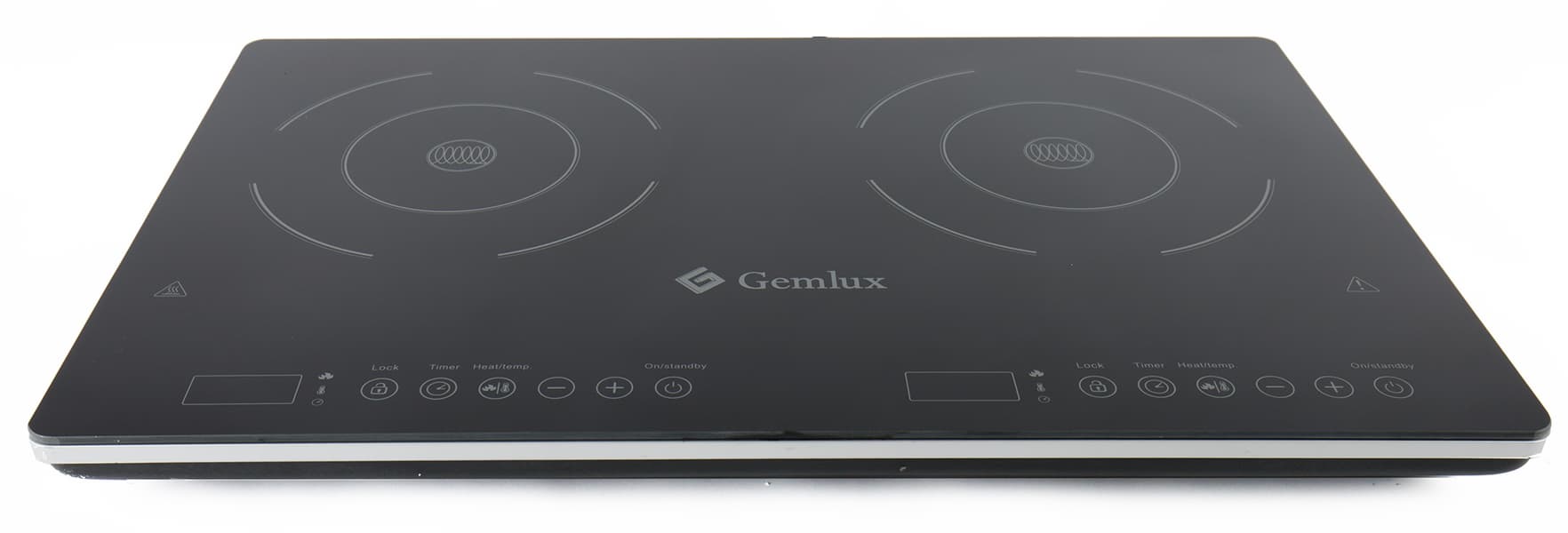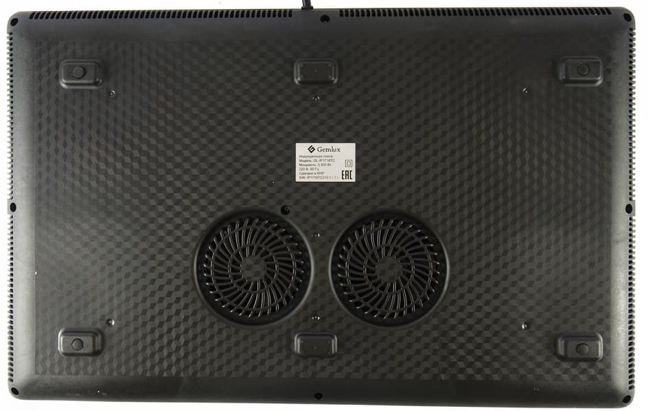 Стильная двухконфорочная плитка строгой прямоугольной формы благодаря своим размерам, дизайну и качеству исполнения смотрится очень солидно и основательно. На глянцевой стеклокерамической поверхности белым цветом качественно нанесены контуры нагрева конфорок с символом индукции посередине, ниже — логотип Gemlux. Размер плитки 60×38 см позволяет готовить в посуде диаметром от 12 до 26 см.