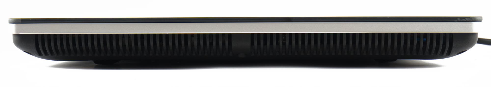 Снизу, по бокам и сзади, предусмотрены вентиляционные прорези. На дне — четыре пластиковые ножки с резиновыми вставками, а посередине наклейка с технической информацией и два круглых вентилятора.