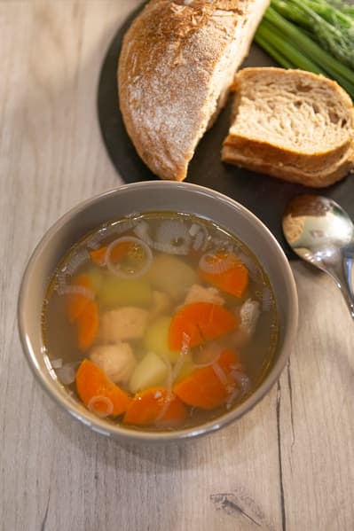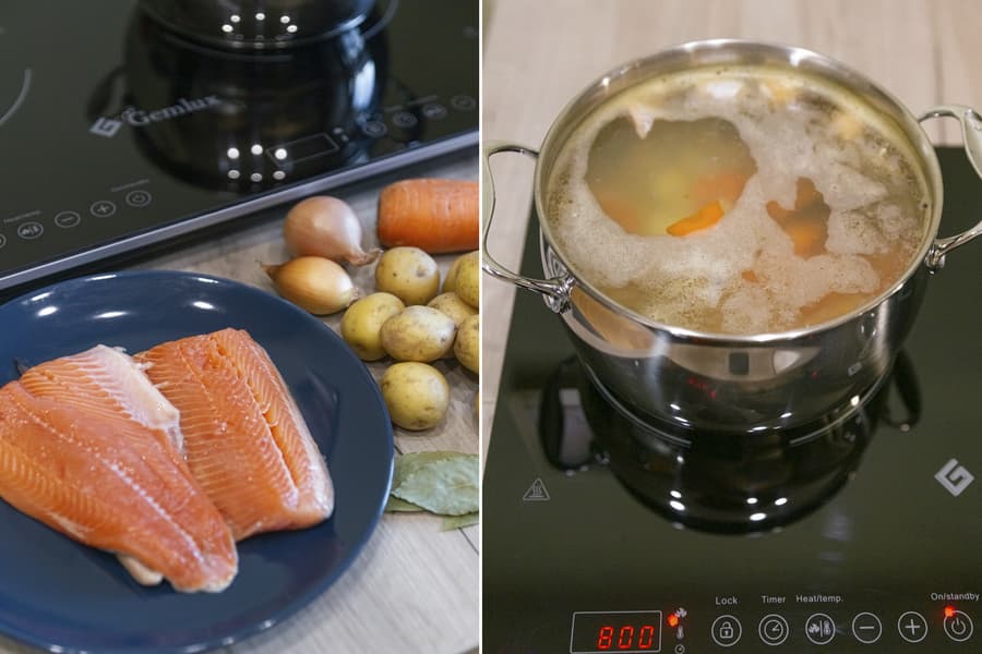 Бульон было важно варить именно «на медленном огне». Мы выставили мощность в 800 Вт. Кипение, как и требовалось, было едва заметным. После выключения плитки дали ухе настояться в течение 15 минут.