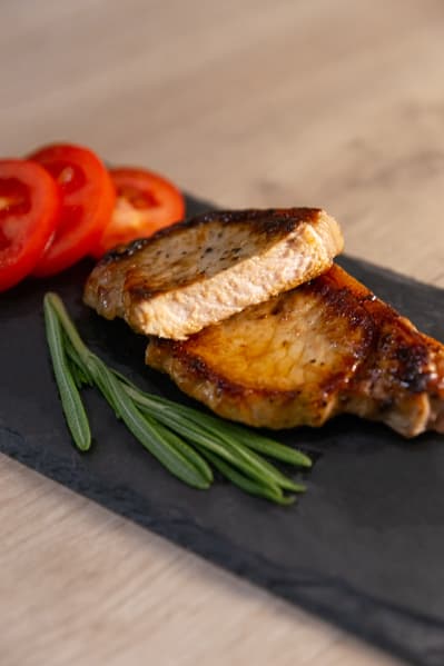 Получился хорошо прожаренный, не сухой кусок свинины. Опять же, без пригораний.