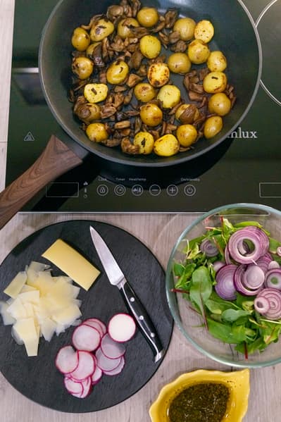 Для начала отварили молодой картофель в мундире. В это же время на соседней конфорке уже разогревалась сковорода для вешенок. Грибы были пожарены на большой мощности до золотистого цвета, чуть позже к ним поместили и вареный картофель. Поджаривали всё вместе, пока на картофеле не образовался легкий «румянец».