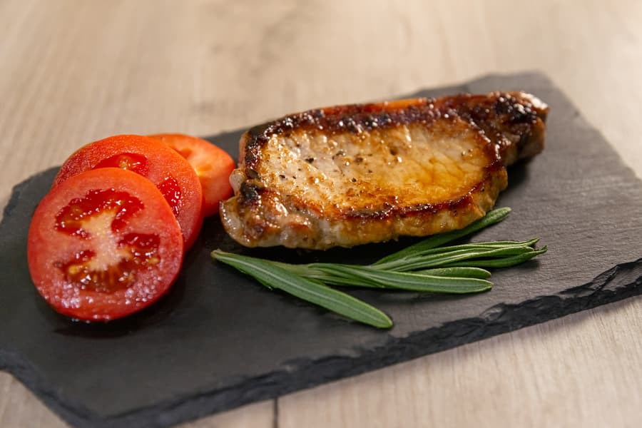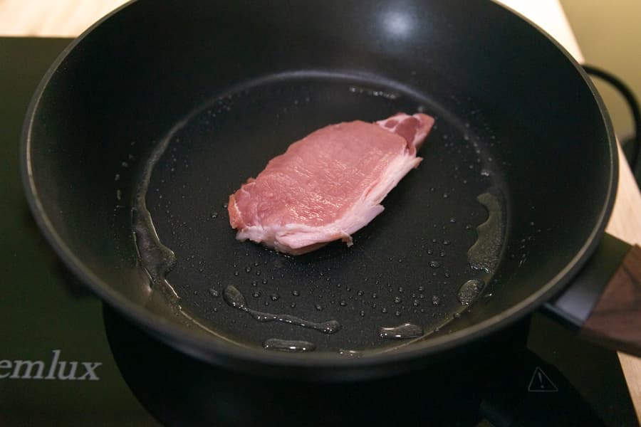 Для этого теста мы выбрали карбонад. Небольшой стейк комнатной температуры посыпали солью, черным молотым перцем и смазали оливковым маслом.