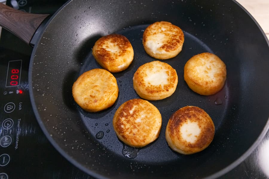 Как мы и ожидали, в центре сырники поджаривались быстрее, но не критично. Мы успевали менять их местами и в итоге получили более-менее равномерную корочку и идеальное прожаривание внутри. Ничего не пригорело.