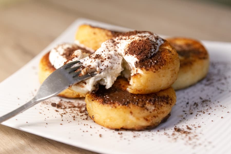 К сырникам добавили сметану и тертый шоколад.