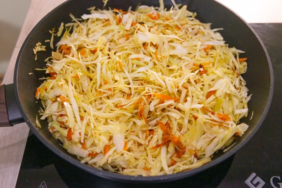 Затем добавили нашинкованную капусту, томатную пасту, немного воды, соли, острого красного перца и оставили тушиться на средней мощности 800 Вт, периодически помешивая.
