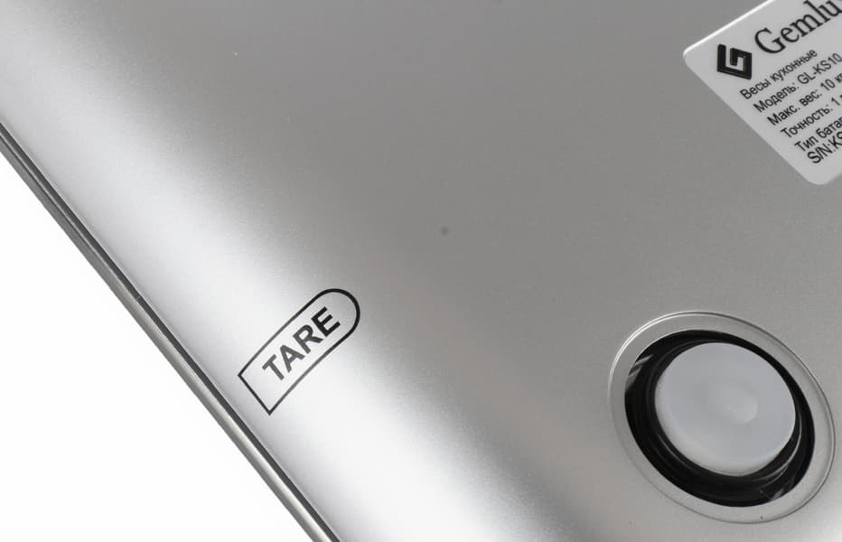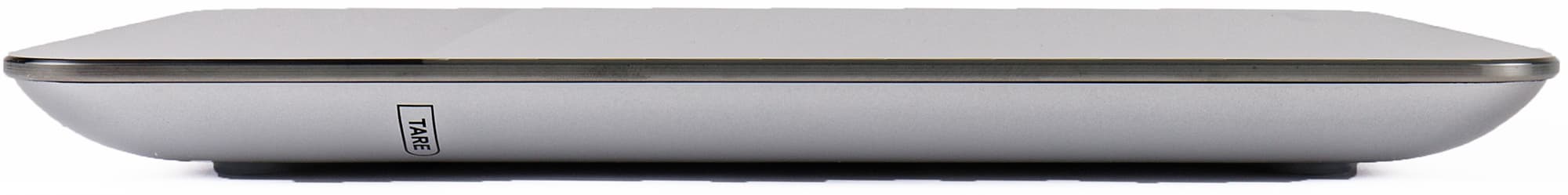 Весы включаются прикосновением к кнопке Tare, расположенной на правой боковой стороне прибора. Сенсорный элемент невозможно нащупать, а его маркировка видна только при взгляде. На то, куда нажимать, указывает оформление рабочей платформы: сенсорная зона находится четко напротив границ серебристой и зеркальной зон верхней панели весов.