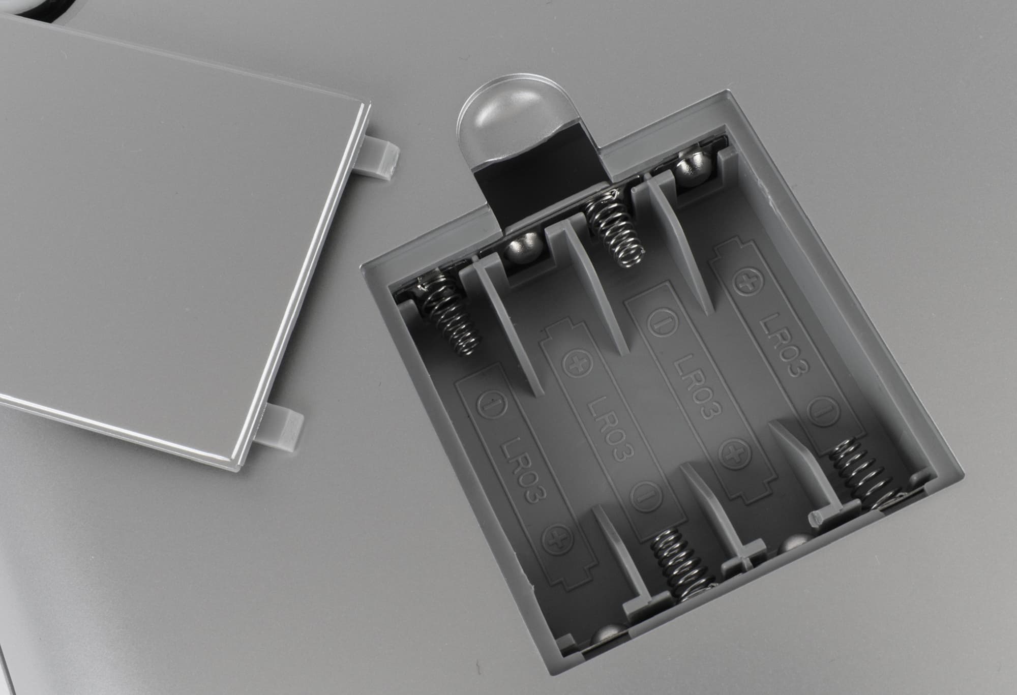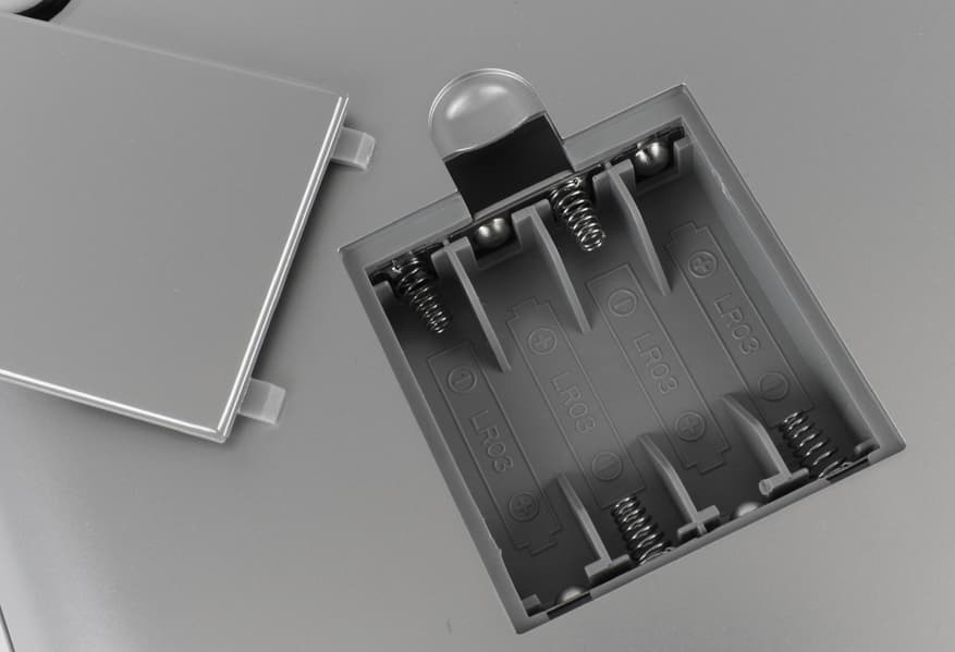 Отсек для батареек скрыт под квадратной крышкой в центре нижней панели прибора. Питаются весы от четырех элементов AAA.