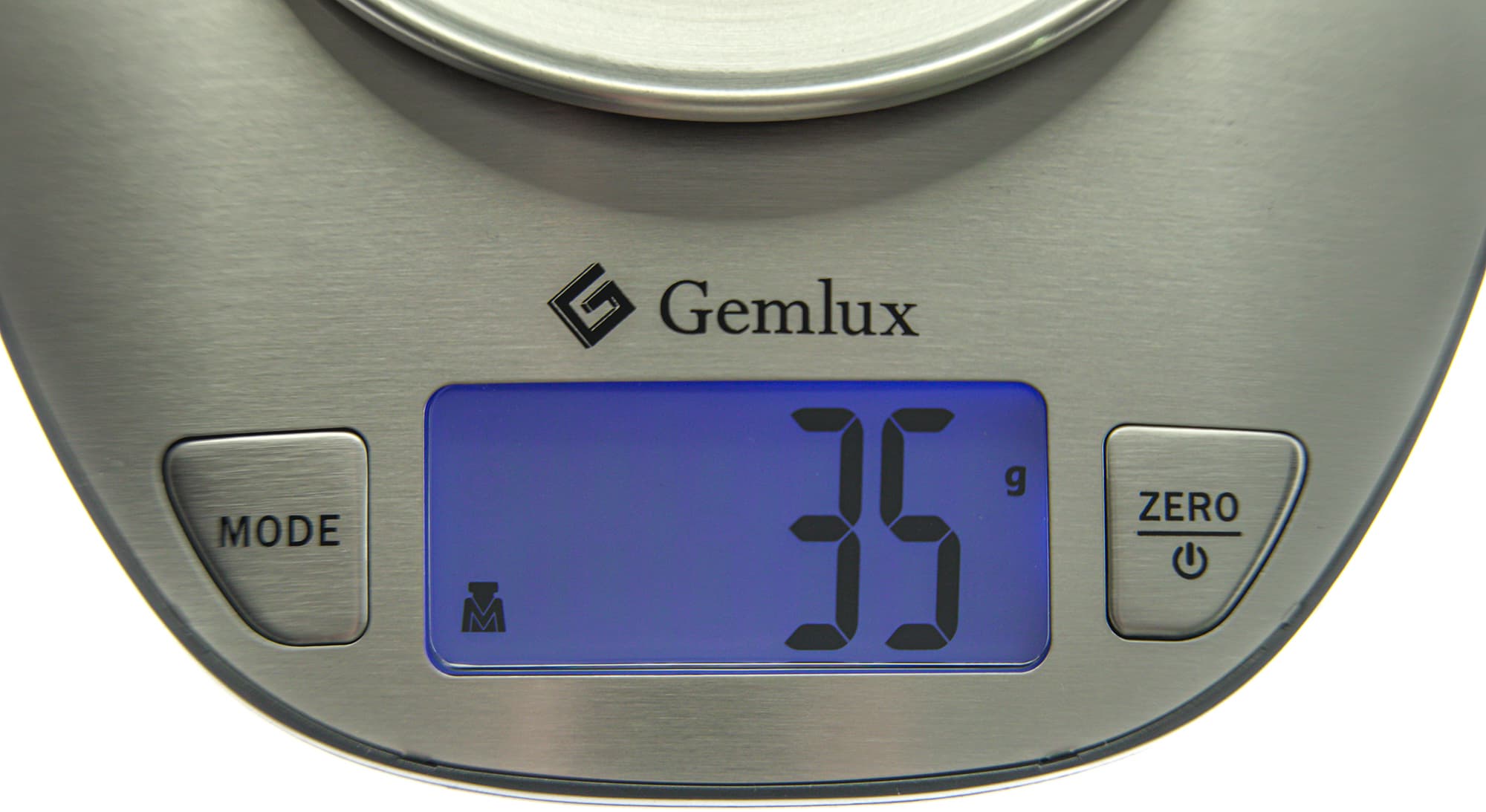 Кнопкой Mode выбирается режим взвешивания. Gemlux GL-KS5SB позволяет взвешивать твердые продукты, показывая на дисплее вес в граммах, или жидкие (объем в миллилитрах). Молоко и вода имеют разную плотность и, соответственно, различный объем при одинаковом весе. Поэтому весы позволяют выбрать тип жидкости: при измерении объема воды на дисплее отображается символ в виде капли, а при выборе молока — та же капля, но с буквой «M». В режиме измерения веса в граммах/унциях на дисплее отображается гирька со вписанной в нее буквой «M» (вероятно, имеется в виду масса).