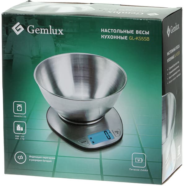 Картонная коробка в традиционной для Gemlux черно-зеленой гамме непривычно велика для упаковки кухонных весов: в комплект GL-KS5SB входит чаша из нержавеющей стали, занимающая значительную часть объема. На лицевой стороне, рядом с фотографией устройства в сборе, перечислены наиболее интересные, с точки зрения производителя, особенности продукта: точность взвешивания до одного грамма, большой диапазон измерений (1 г — 5 кг), наличие индикации перегрузки и разряда батареи.