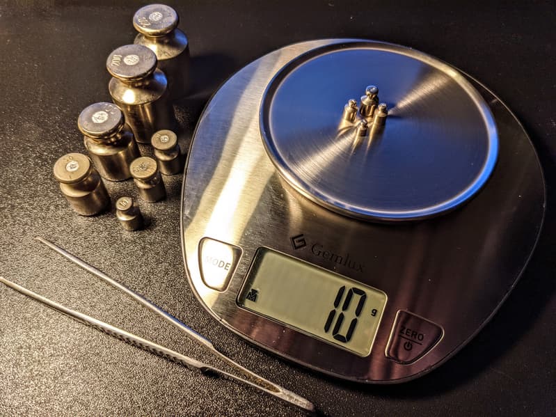 Чтобы оценить точность взвешивания, мы воспользовались эталонным набором гирь-разновесов и провели серию измерений в диапазоне от 1 до 1000 г. Полученные результаты свели в таблицу.