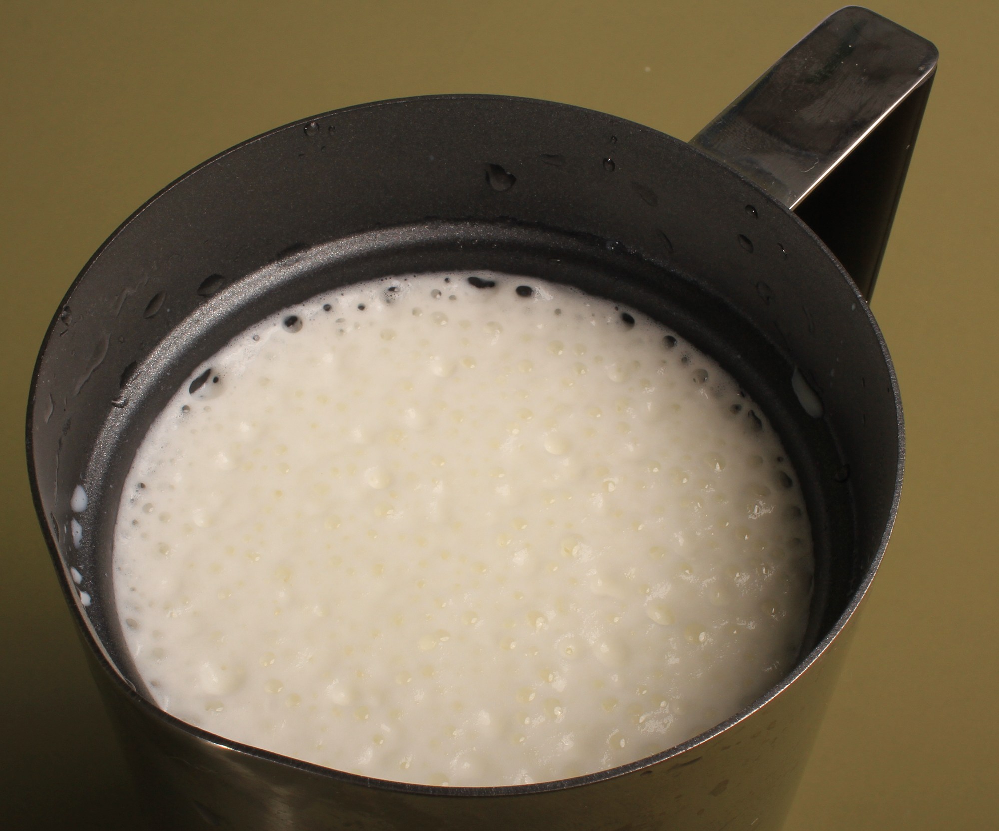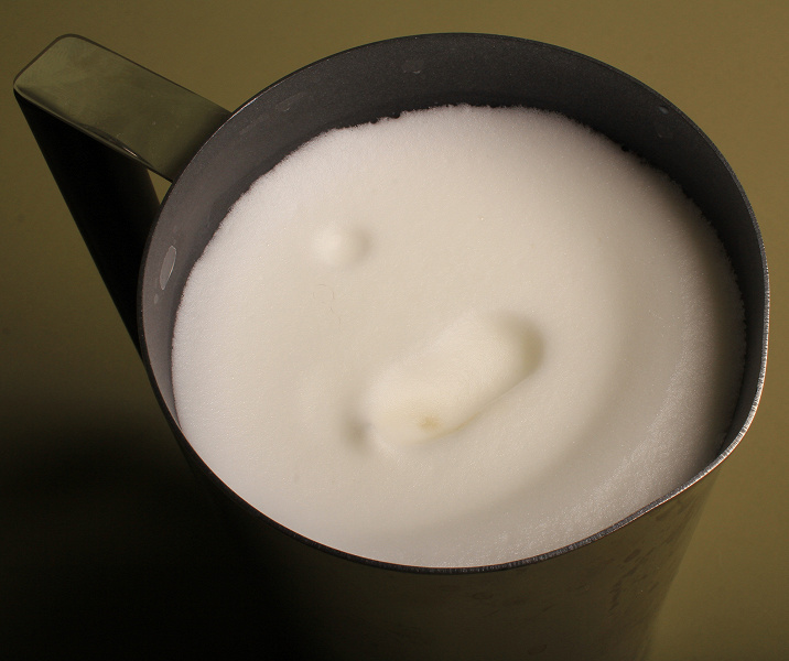 Молоко пониженной жирности мы взбили с подогревом и получили примерно такую же мелкопузырчатую пенку, как и с более жирным молоком. Однако она быстрее оседала, хотя ее все равно можно было использовать для капучино, а не только для латте.
