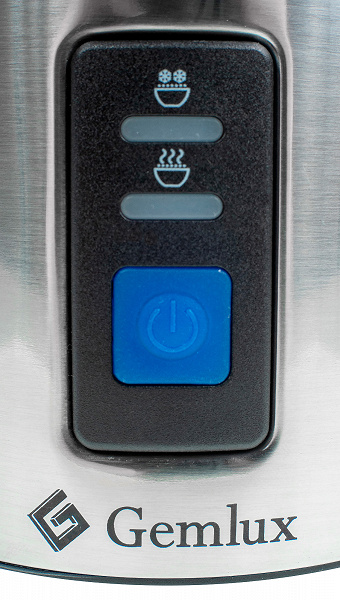 С одной из сторон корпуса находится простая панель управления: синяя кнопка (единственный цветной элемент подогревателя) и два светодиода: для индикации режима вспенивания (иконка чашки со стилизованным облачком пены над ней — хотя мы подумали сначала, что это снежинки) и режима подогрева (чашка горячего молока).