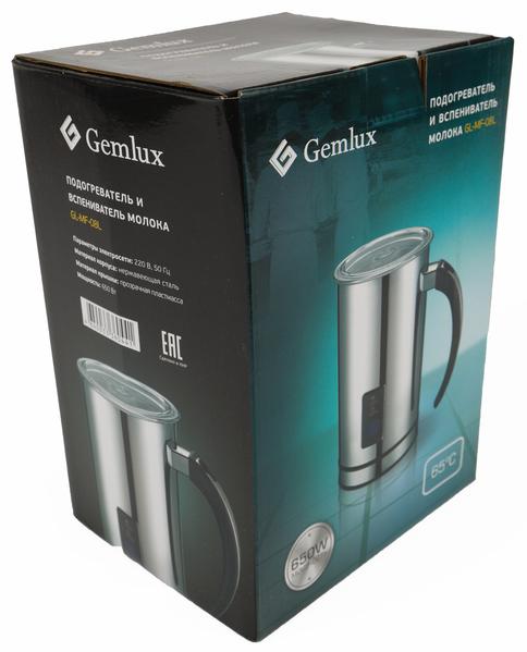 Коробка со вспенивателем оформлена в фирменном стиле Gemlux: на черно-бирюзовом фоне красивое фото устройства, название модели, информация о мощности и основных характеристиках устройства.