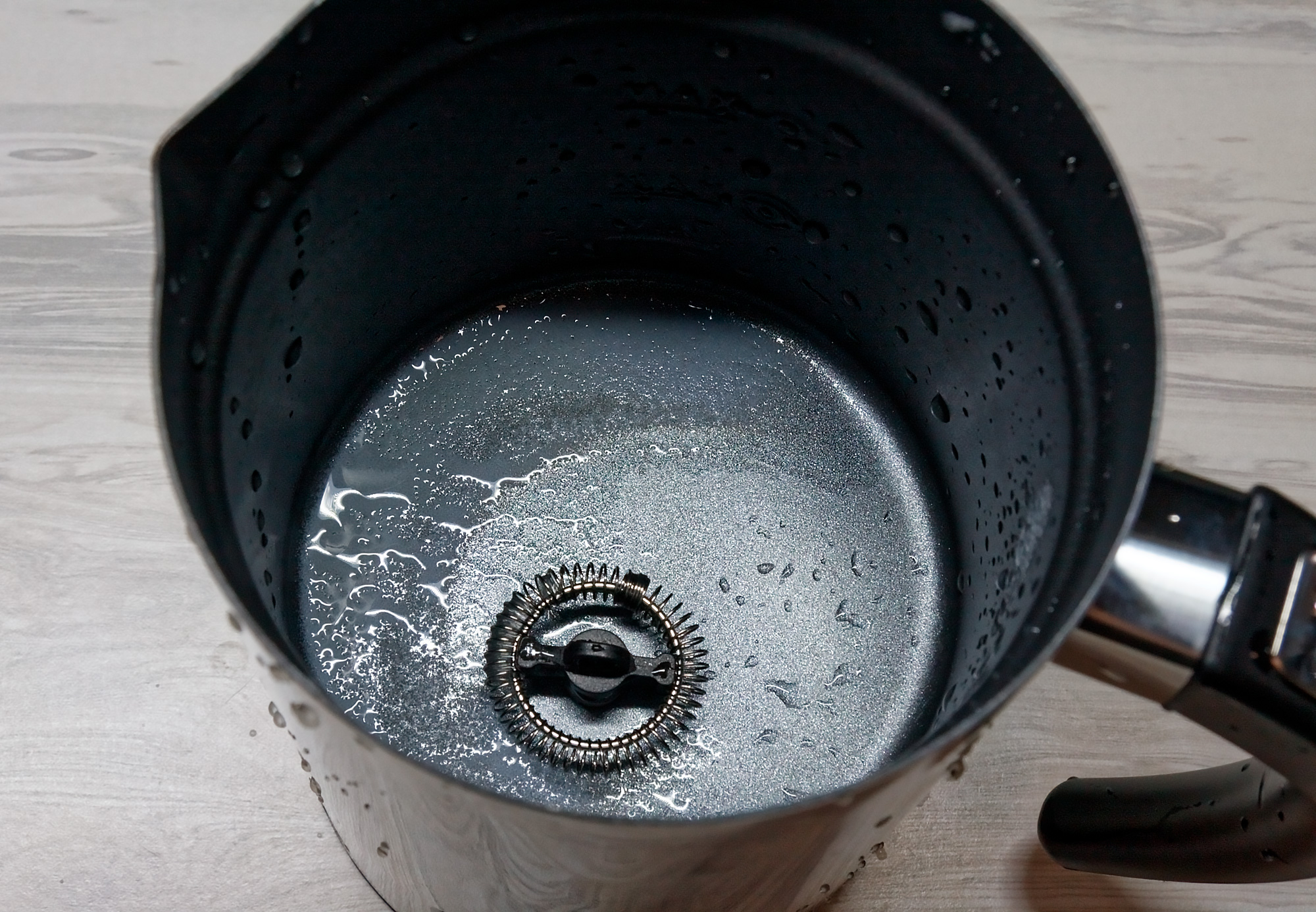Еще один нюанс, связанный с работой датчика температуры — если требуется приготовить (подогреть или взбить) несколько порций молока подряд, то для корректной работы датчика может потребоваться предварительно охладить вспениватель. Мы решили этот вопрос очень просто — сначала смываем остатки молока с помощью губки, после чего промываем кувшин холодной водой из-под крана. Этого оказывается достаточно для того, чтобы сразу же использовать прибор повторно.