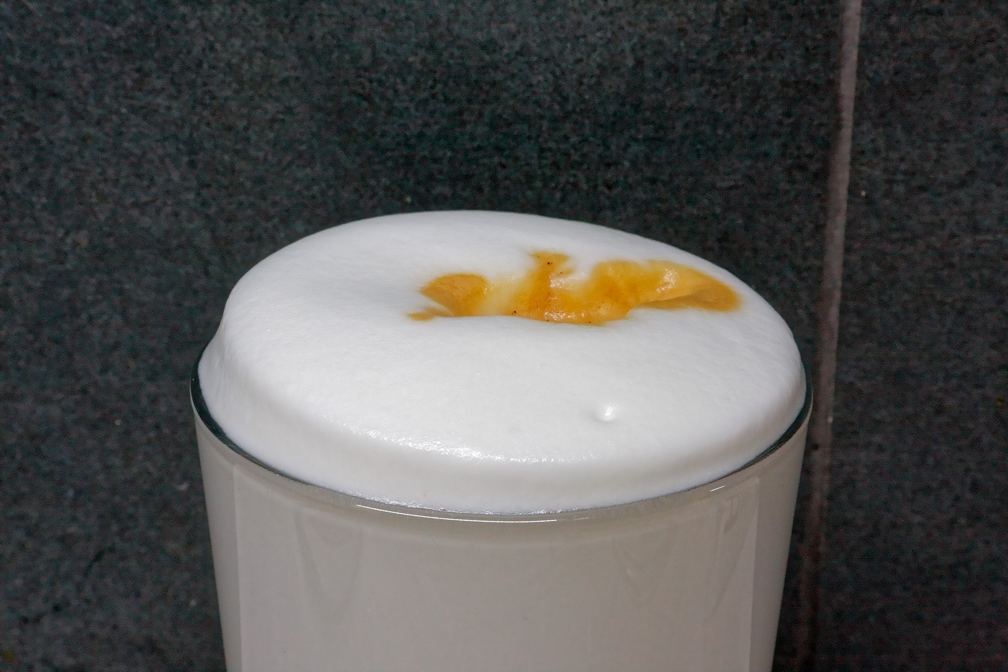 Обратите внимание, насколько хорошо и уверенно держится пышная молочная «шапка», выступающая над стаканом.