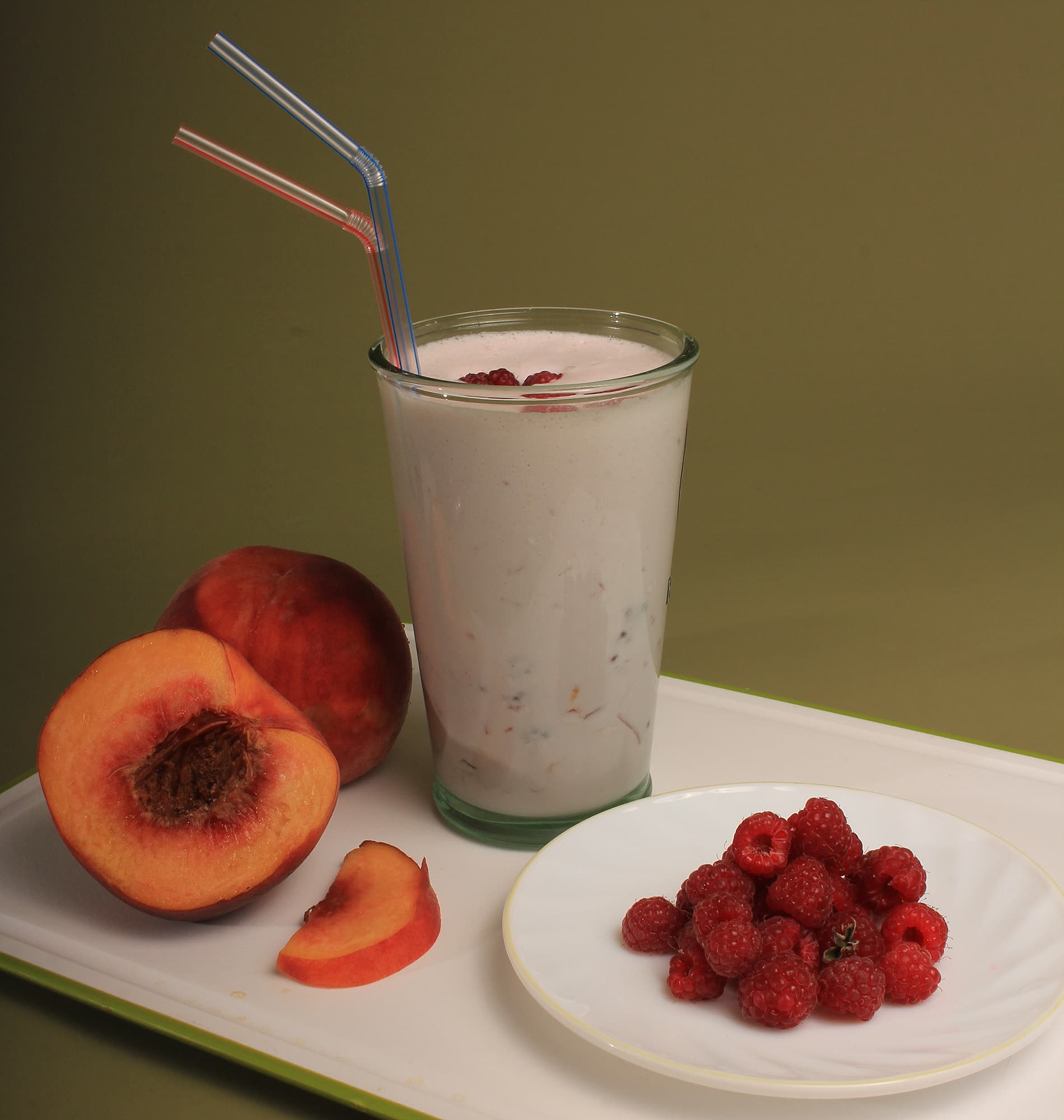 В стакан положили 50 граммов пломбира, половину крупного персика, нарезанного мелкими кусочками и целые ягоды малины. Залили молоком и взбивали около трех минут. Получился коктейль с нежным фруктовым вкусом, но большая часть фруктов осталась на дне.