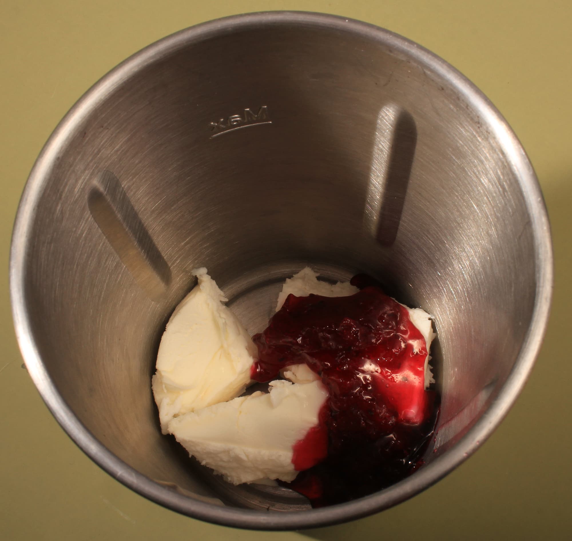 Перед началом работы мы вымыли стакан теплой водой с мягким моющим средством и обтерли венчик. В стакан выложили примерно 50 граммов пломбира, разделив его на несколько кусков, 30 граммов черносмородинового варенья и залили молоком по отметку «Max».